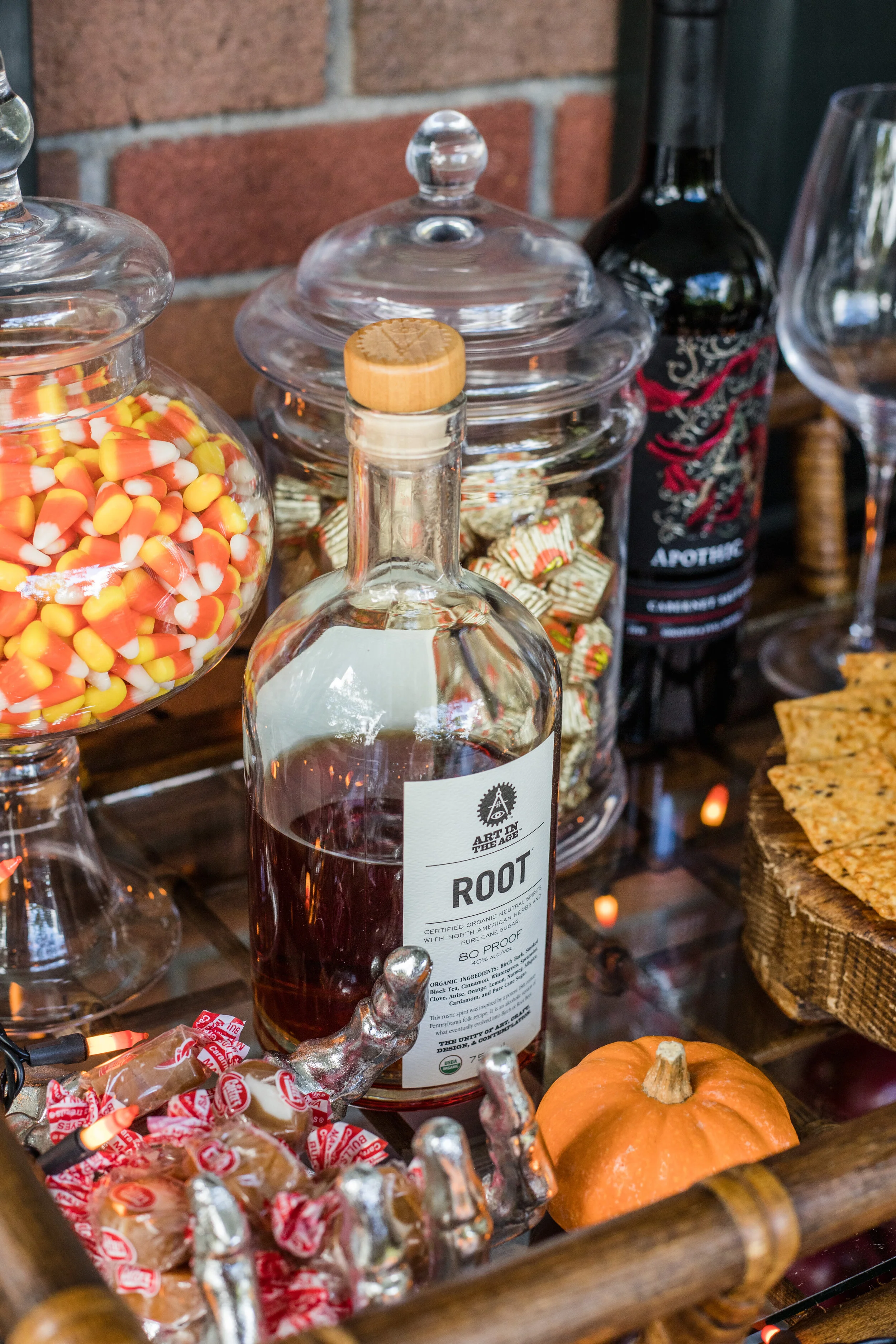 I included glass jars filled with candy, apples and a cheese ball. I also have a few adult beverages mixed in with skulls, pumpkins and candles. I draped Halloween lights around the bar cart and Ms. Witch watches over the whole thing!