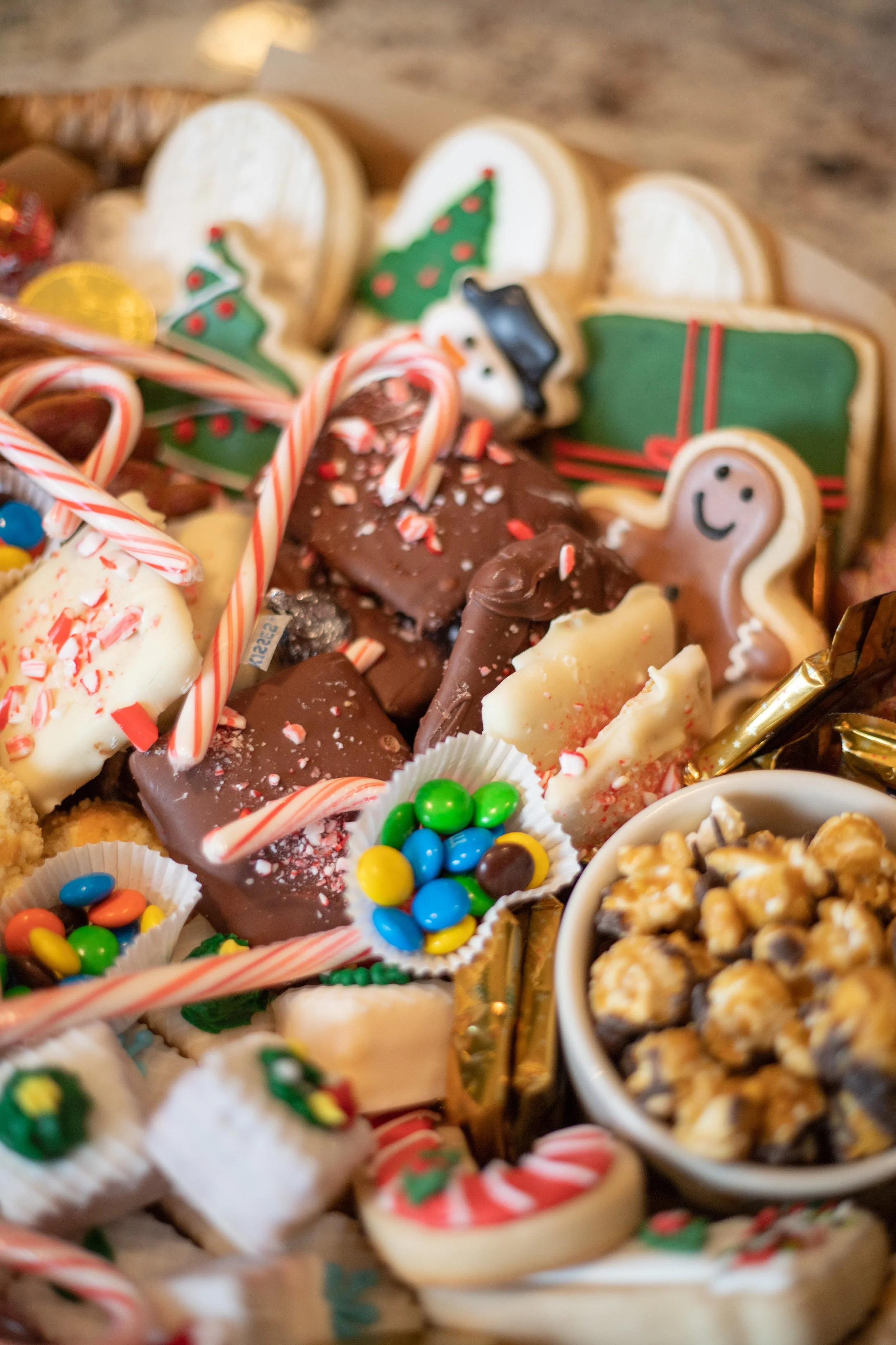 I used decorative Christmas sugar cookies that I purchased from a local baker, caramel popcorn, cute and festive petit fours that I found at the grocery store, candy canes, M & M’s, Hershey kisses, oatmeal raisin cookies, and other assorted candies. I just played with the arrangement until it made me happy so there is no specific order, except if you’re using M & M’s in little cupcake holders, add them last.