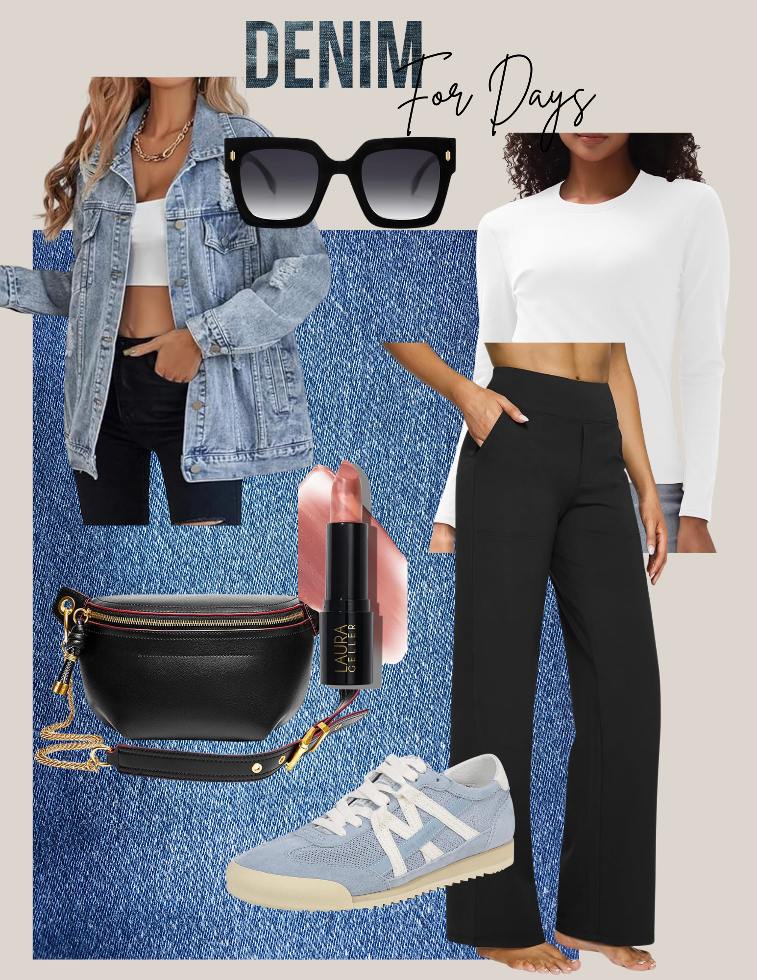 //Oversized Denim Jacket//Black Sunglasses//Long Sleeve White Tee (I own 3 of these and love them!)//Wide Leg Joggers//Light Blue Sneakers//Laura Geller Lipstick//Black Crossbody Bag//