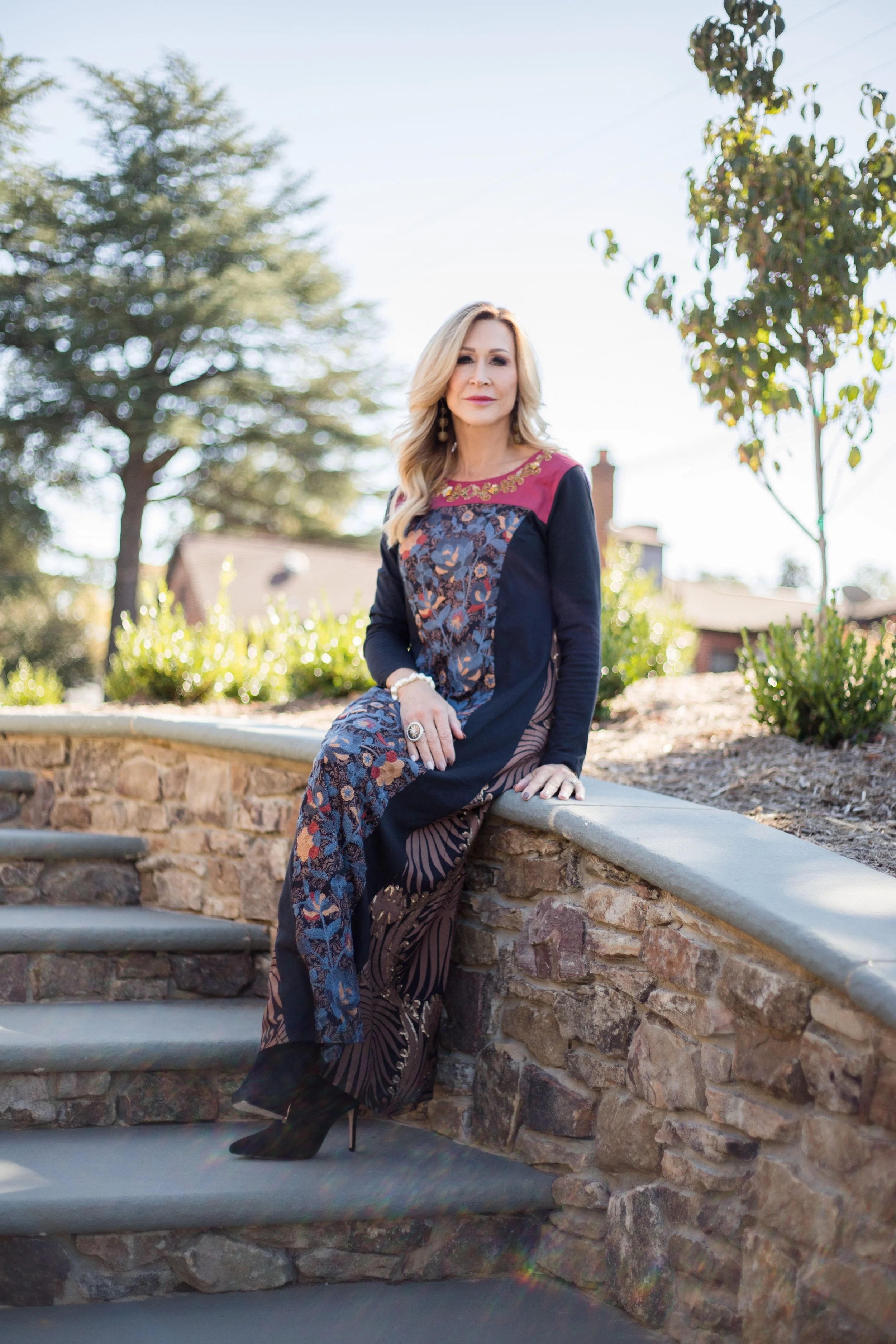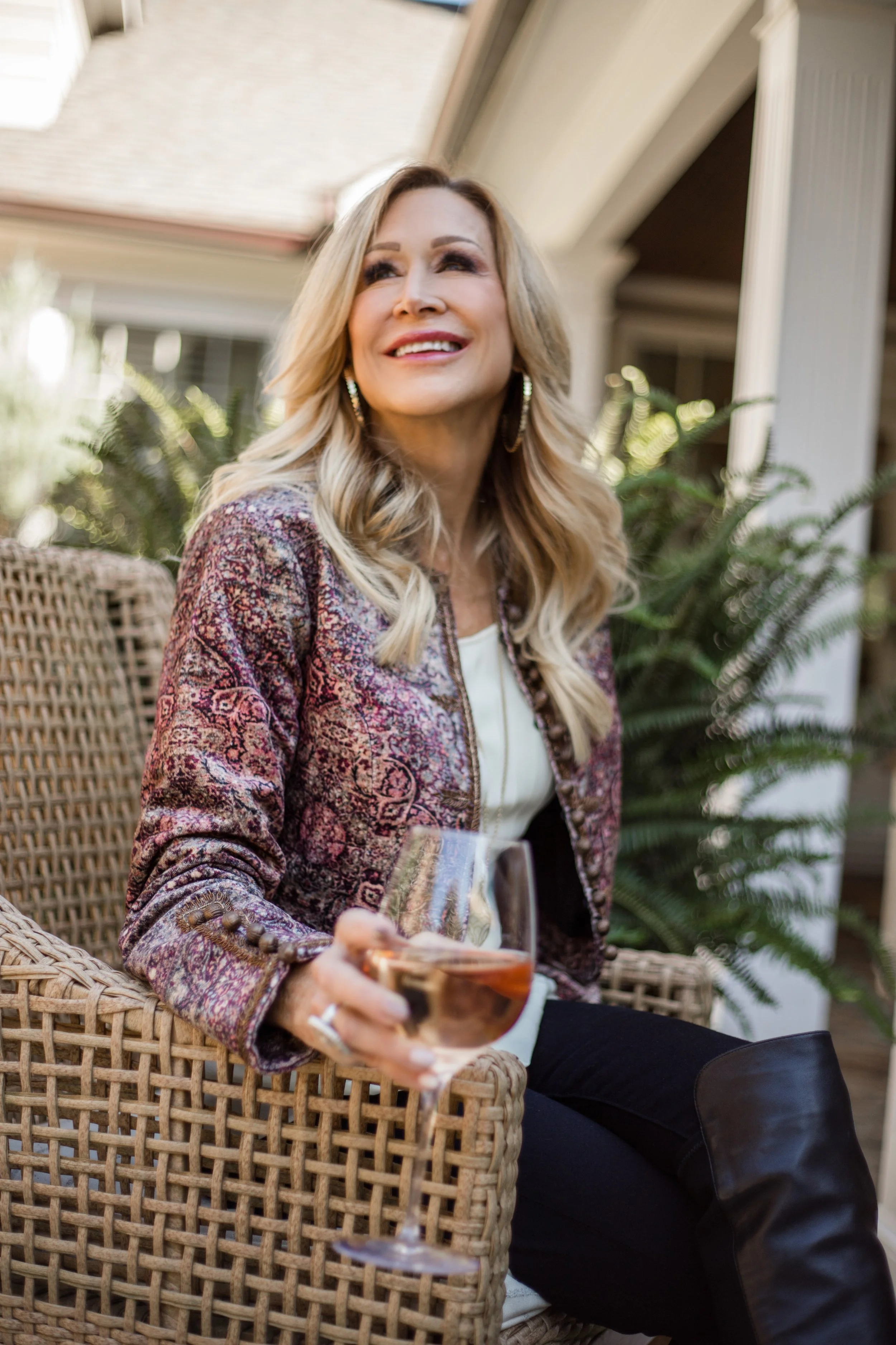 The next piece Iβm wearing is the Icon Velvet Bolero. I styled it more casually with flat tall boots, black jeans and a sleeveless blouse which would be an ideal outfit to wear to an outdoor event or out to dinner. It would also be fabulous over a jumpsuit or dress. Again, as with every piece from Soft Surroundings, the detail on this jacket is so beautiful and itβs a classic piece youβll keep in you closet for years to come!