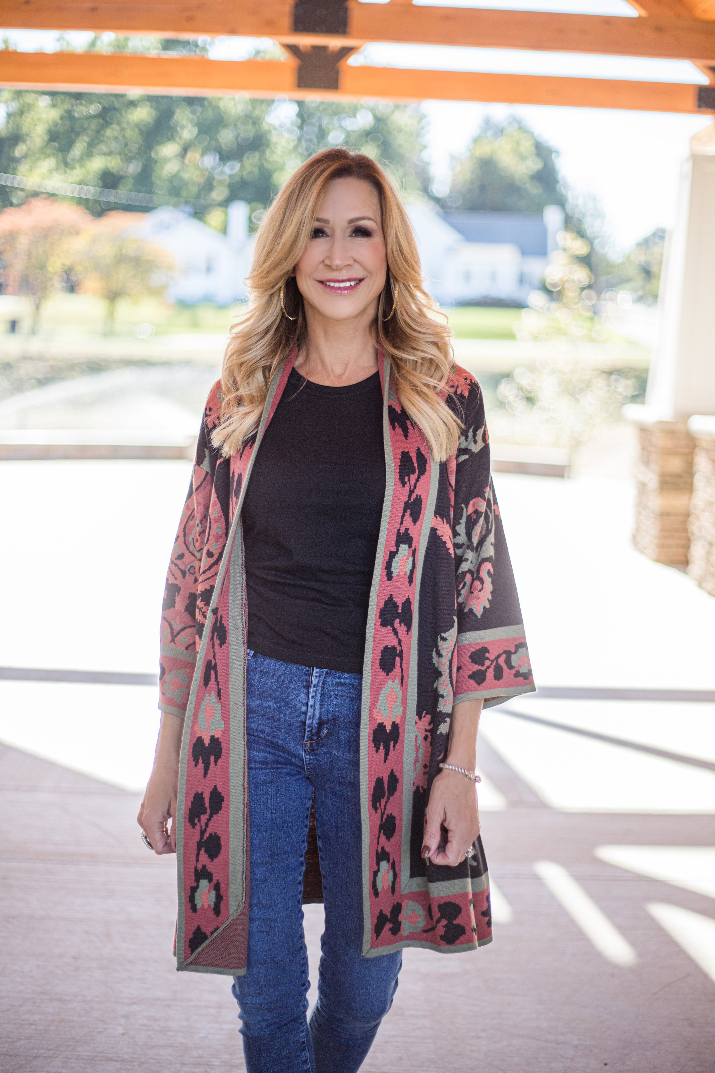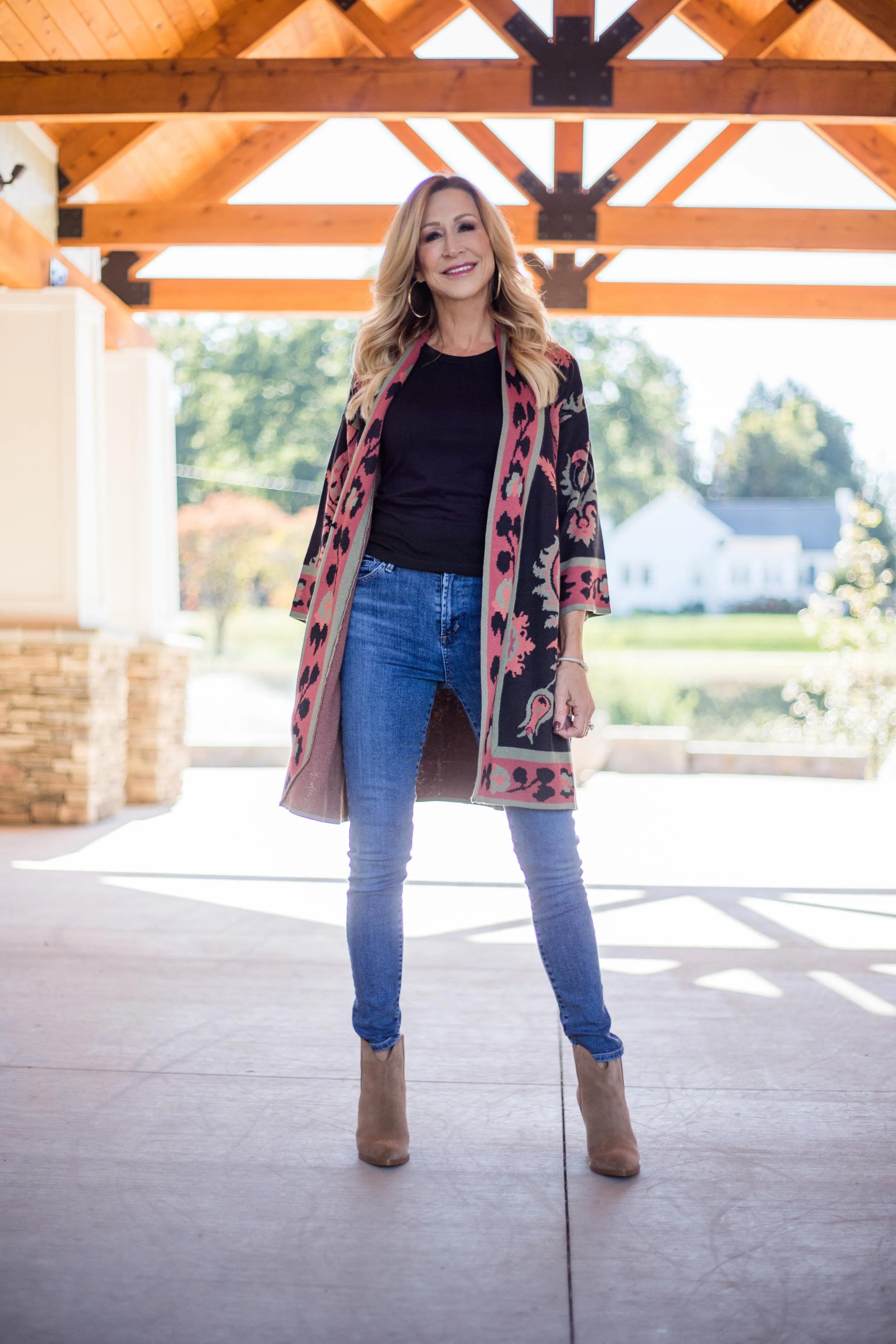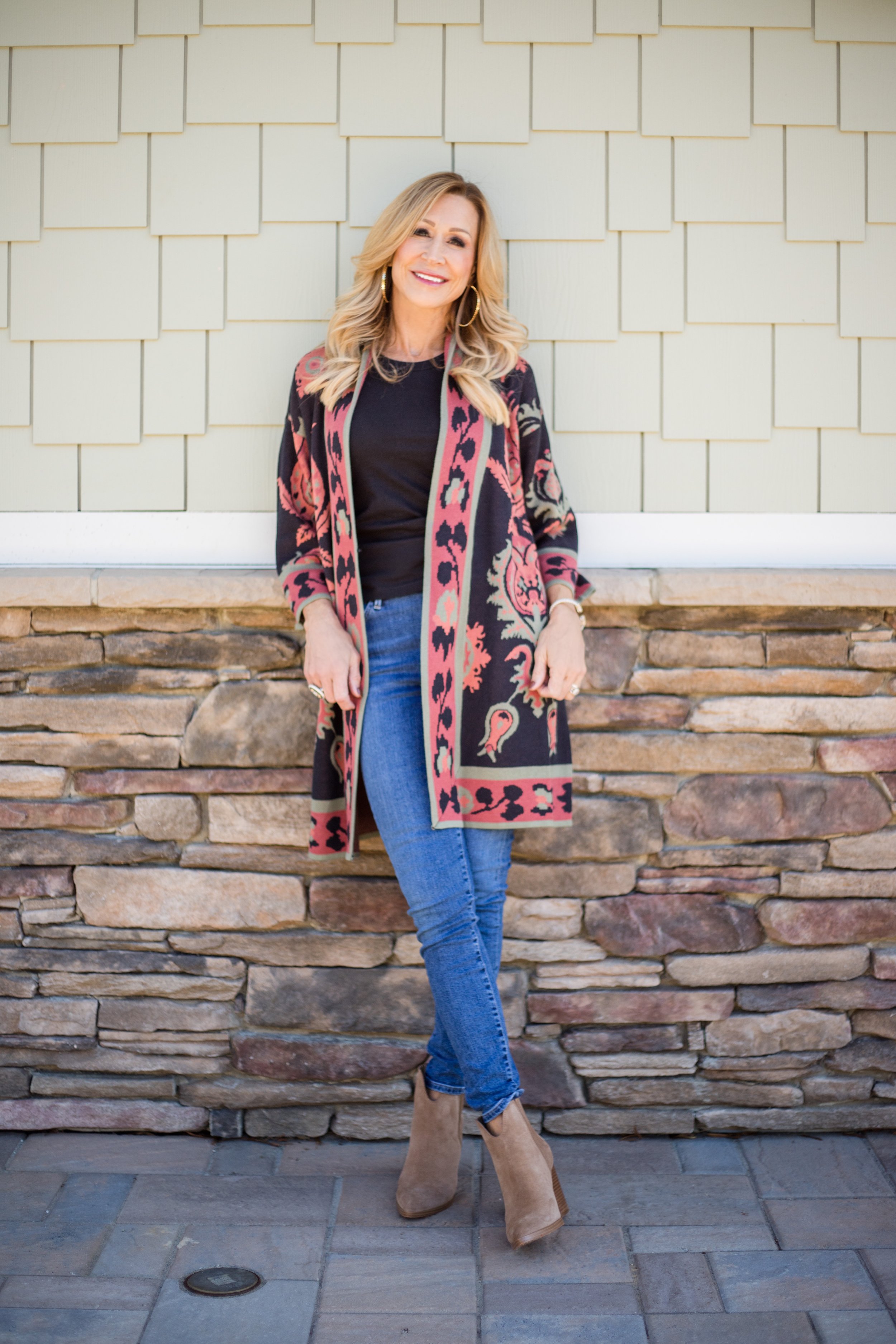 I will get so much wear out of this great cardigan sweater! The Icon Sweater Cardigan is a piece youβll reach for again and again. Styled with jeans, itβs perfect for running errands or any casual event. It can also be dressed up with a column of black and a dressier boot or shoe. Iβve styled it here with skinny jeans, brown booties and a black tank which Iβll replace with long sleeves when the weather gets cooler!