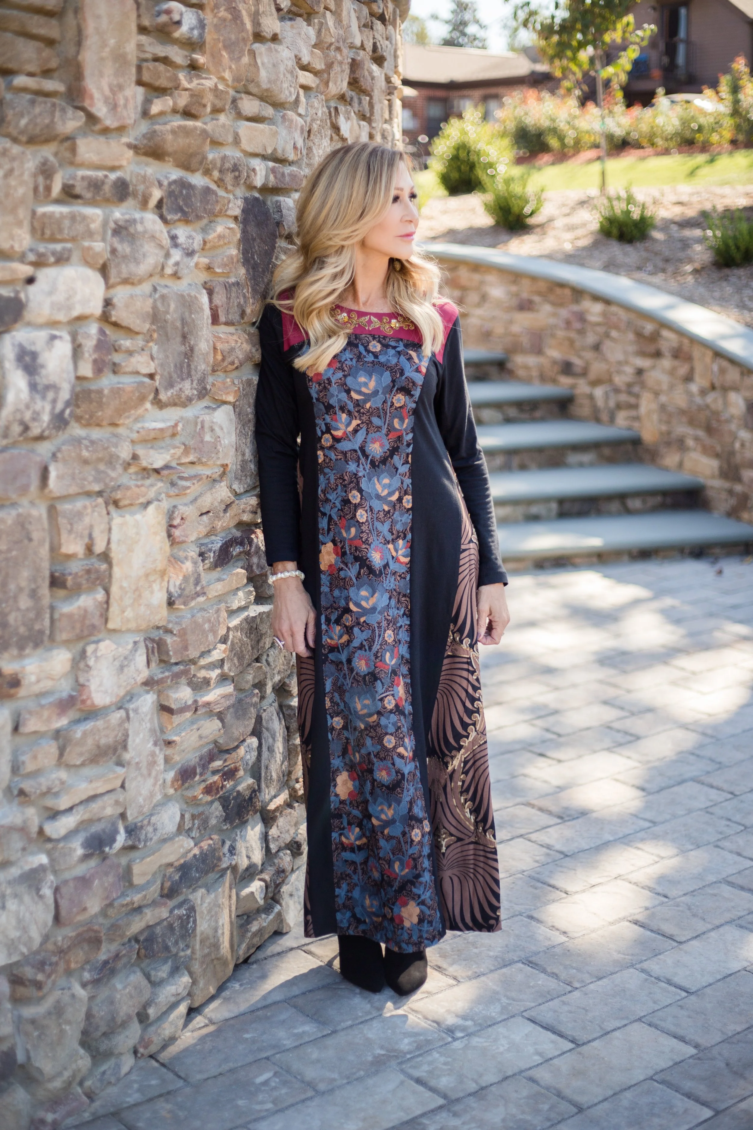 The Icon Sultana Dress makes quite a statement because of the panels that flow as you walk. There are so many things to love about this dress including the different patterns of fabric mixed together, the gold embroidery around the neck and the long sleeves. The side panel also has sequins running throughout the fabric. Iβve styled this dress simply with black booties and canβt wait to wear it soon!