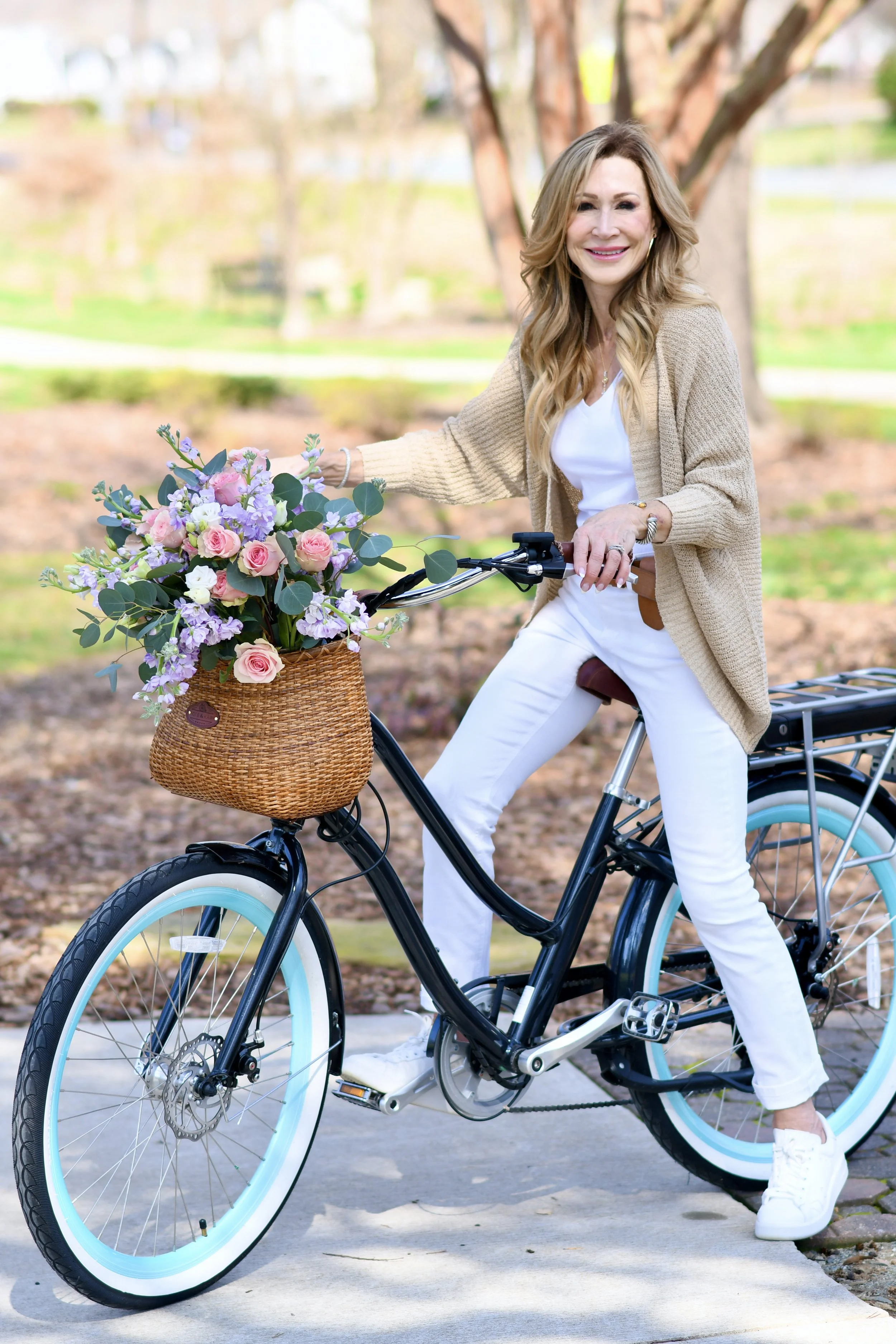 I love wearing jackets in the spring because they add a layer of warmth when the weather is cool and also add interest to an outfit. This season, you’ll find beautiful leather jackets in fabulous spring colors like the fabulous blue peplum jacket I’m wearing here from Boston Proper! It’s so flattering and perfect with white but also looks amazing with black, denim and even pink. It’s a jacket you’ll reach for often.