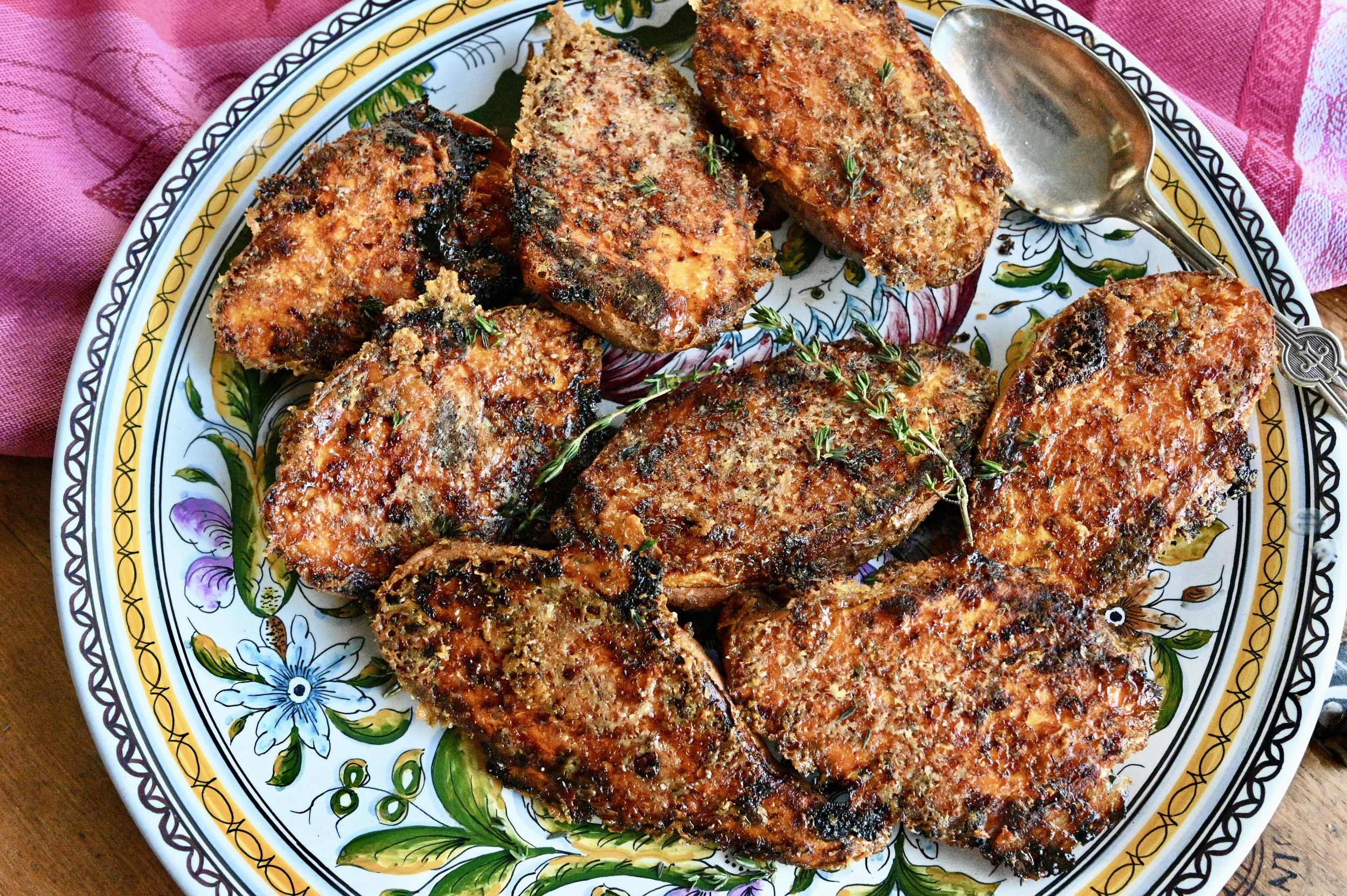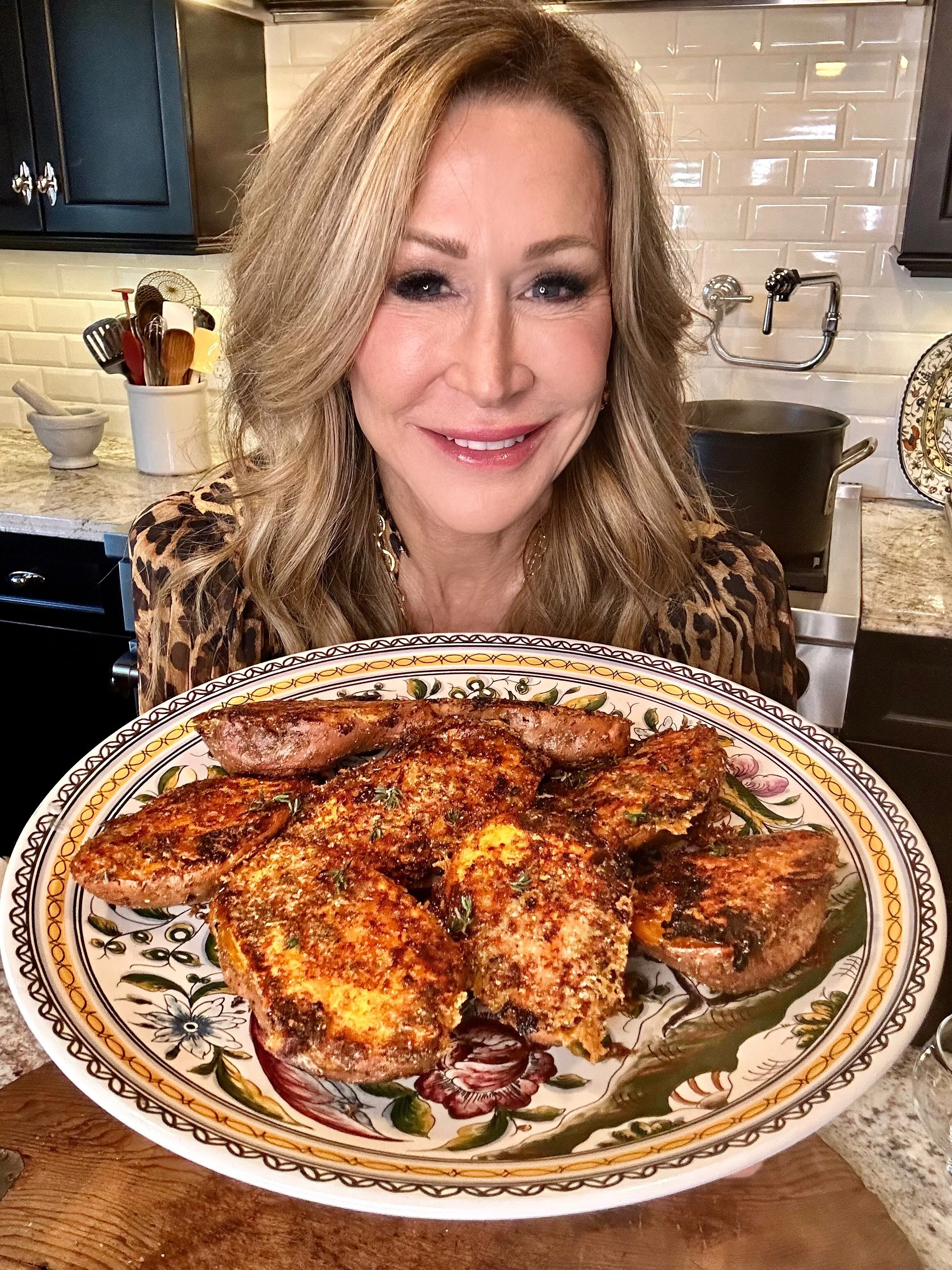 I served the Crispy Parmesan Sweet Potatoes on a gorgeous Portuguese platter that belonged to my best friends Motherβ¦we called her Kiko. I love having this beautiful platterβ¦every time I use it, I think of Kiko! She loved beautiful things, delicious food and good wine!