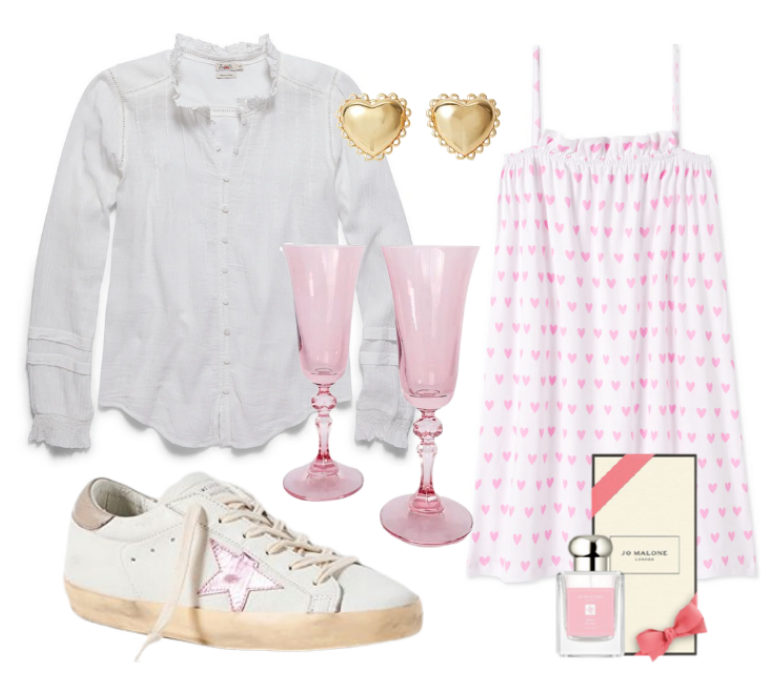 I’m dying over these Golden Goose sneakers with a pink heart! If you don’t have a pair, this might be the time to buy some! They’re so comfortable and definitely trending for spring! A white lacy top makes a great gift for any girl and can be worn year round! Jo Malone makes my favorite colognes and I this special limited edition Rose Blush Cologne is sure to be a hit! If you’re looking to support a woman owned company…look no further than Estelle Colored Glass for these gorgeous pink champagne flutes! They are perfect to hold your Valentine’s Day champagne! These precious heart earrings make a classic gift and the heart nightgown would make such a thoughtful gift!