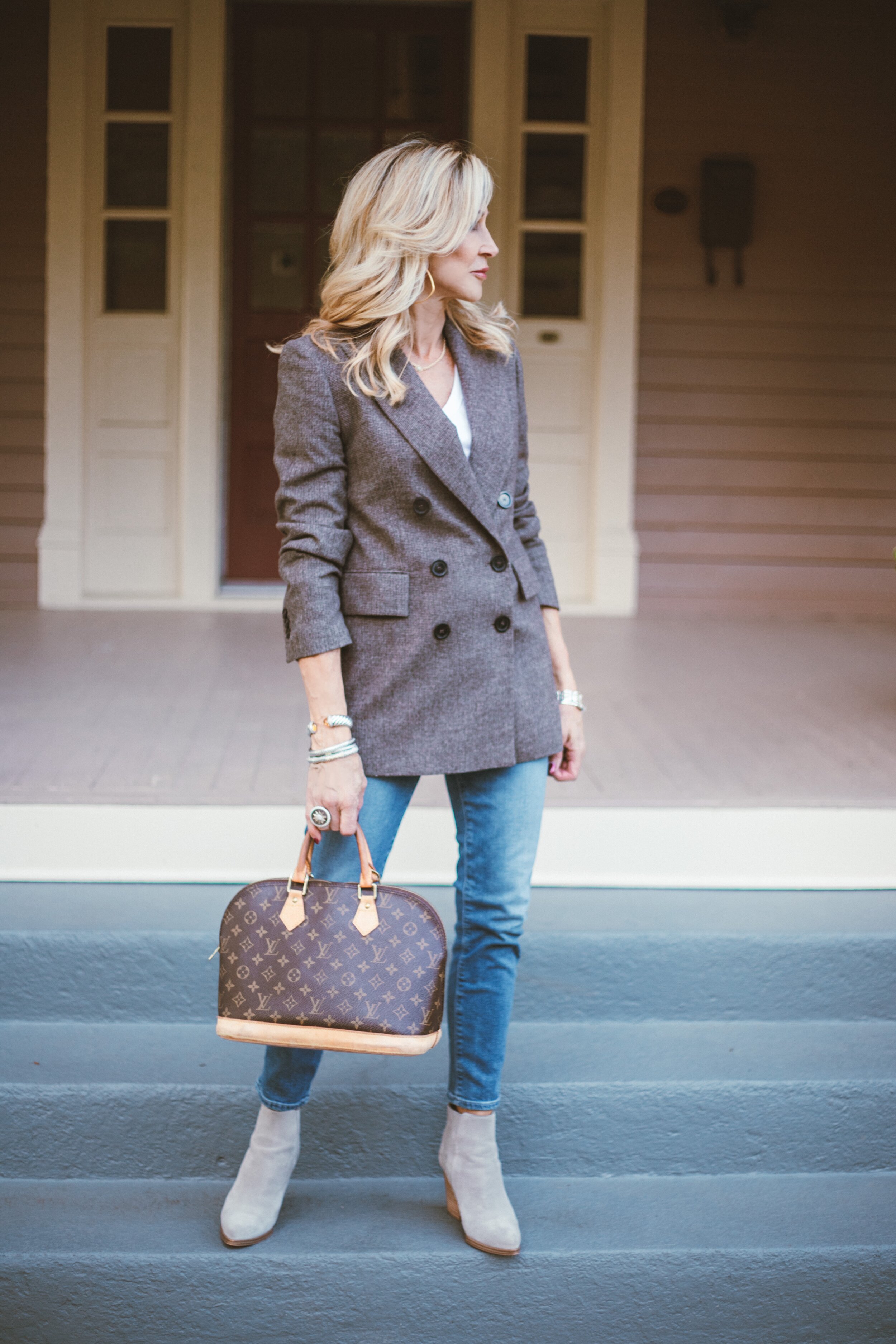 This heel height plus the cropped jeans balances out a longer blazer.