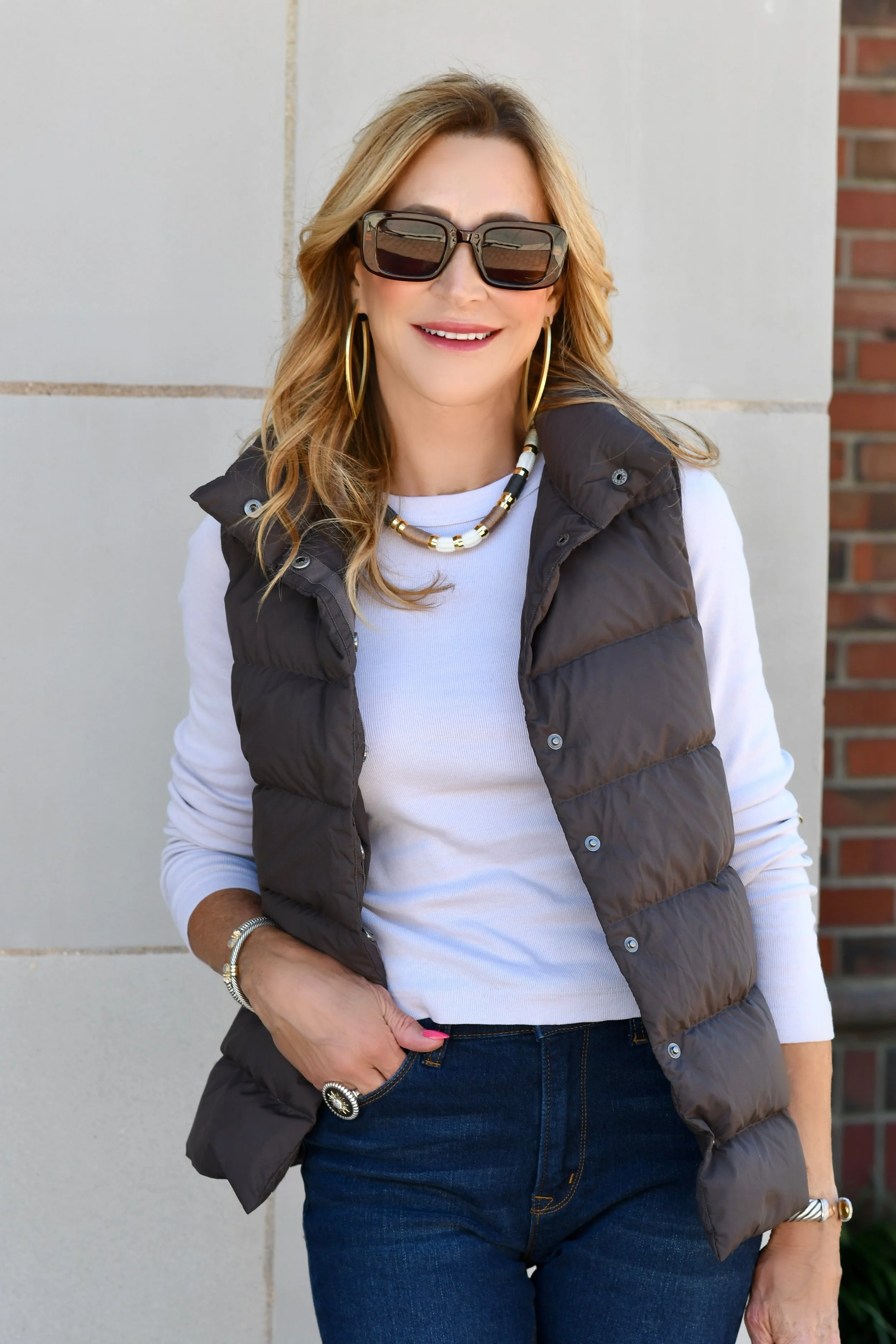 Everyone needs a chic little puffer vest and this Anders Vest from Brochu Walker will be a forever classic in my closet! The designer touches like the high stand collar and the grosgrain detailing on the closure are standard details for Brochu Walker and one of the many reasons I love the brand! This down filled vest is lightweight and features side pockets (love pockets) for stashing keys, credit card and phone if needed! This stylish vest will go with everything in your wardrobe and youβll reach for it again and again!