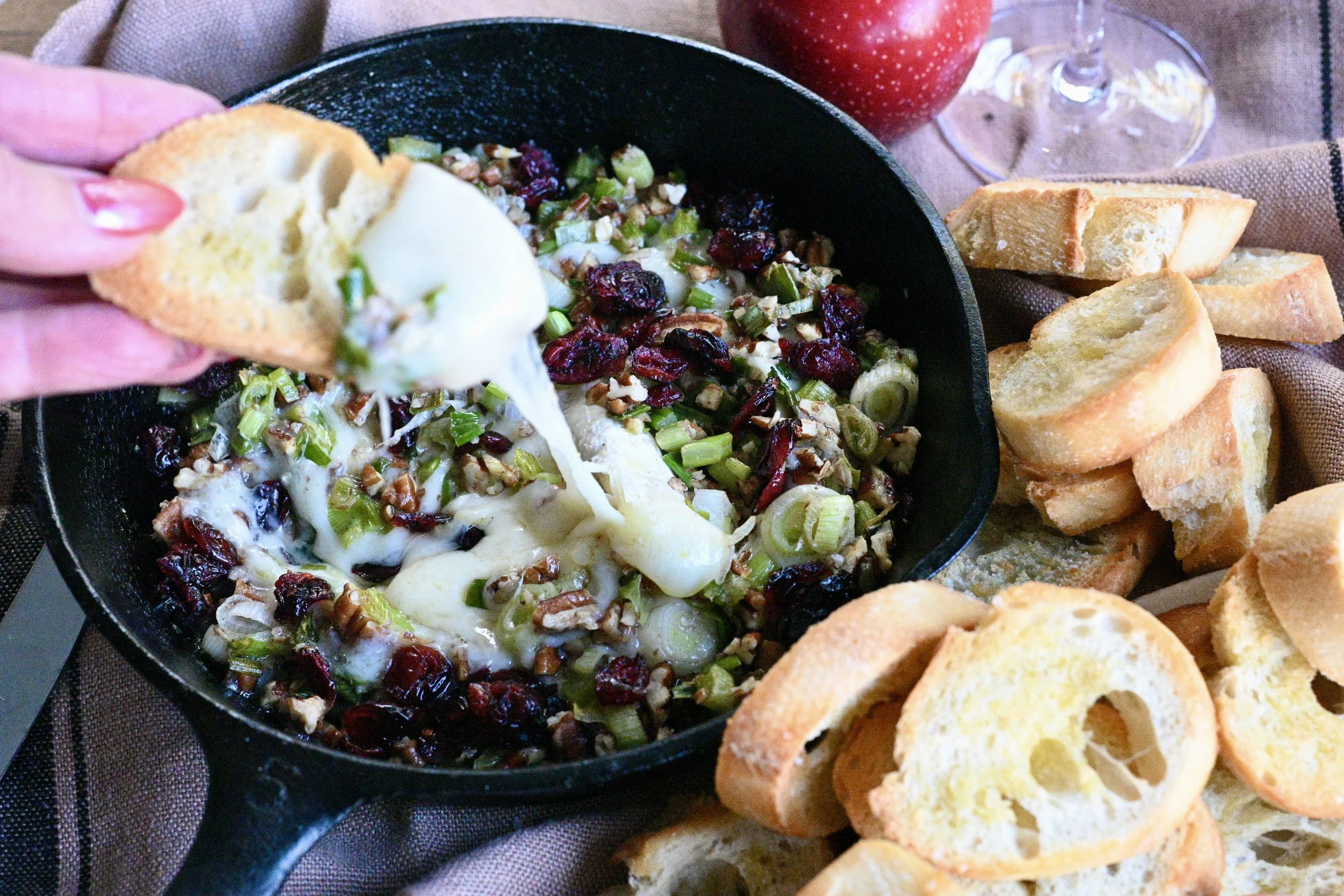 I baked this brie appetizer in my grandmother’s tiny cast iron skillet that my mom also used for years. It’s just the right size for this easy, crowd-pleasing appetizer. The creamy brie gets topped with buttery scallions, toasted pecans, and a handful of dried cranberries for a little sweetness. It’s simple, elegant, and the pecans give it a Southern twist…it’s the kind of appetizer that feels special but is so easy to put together. Serve it bubbling hot with toasted baguette slices and a glass of wine!