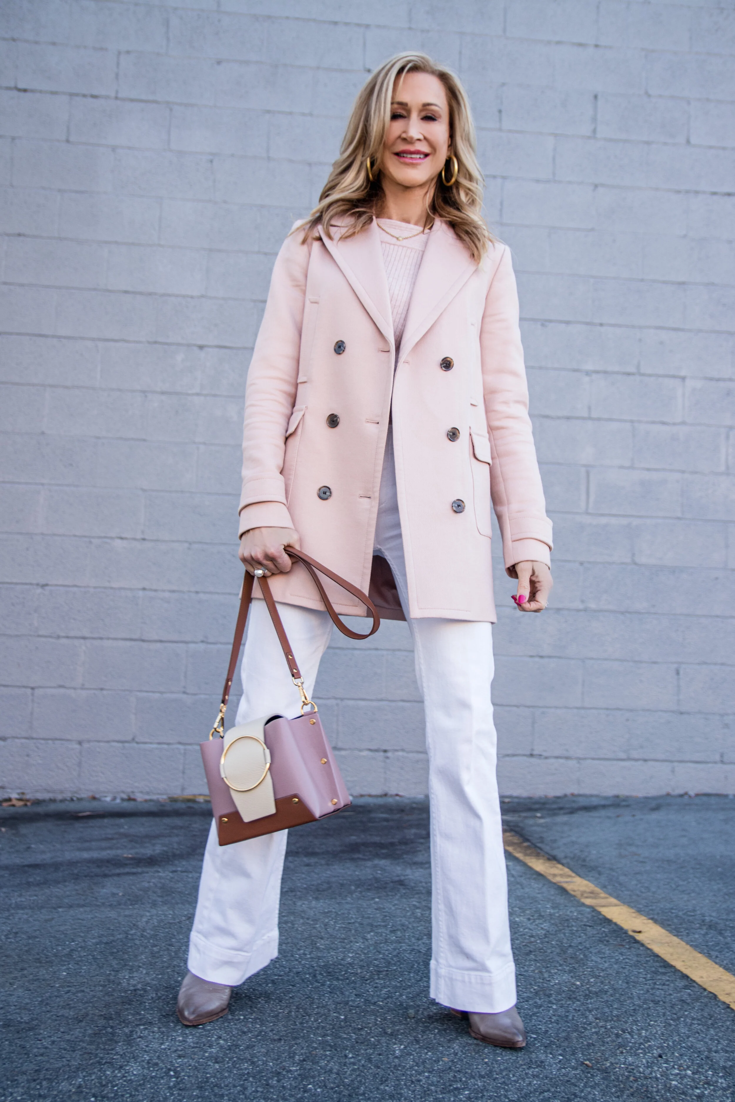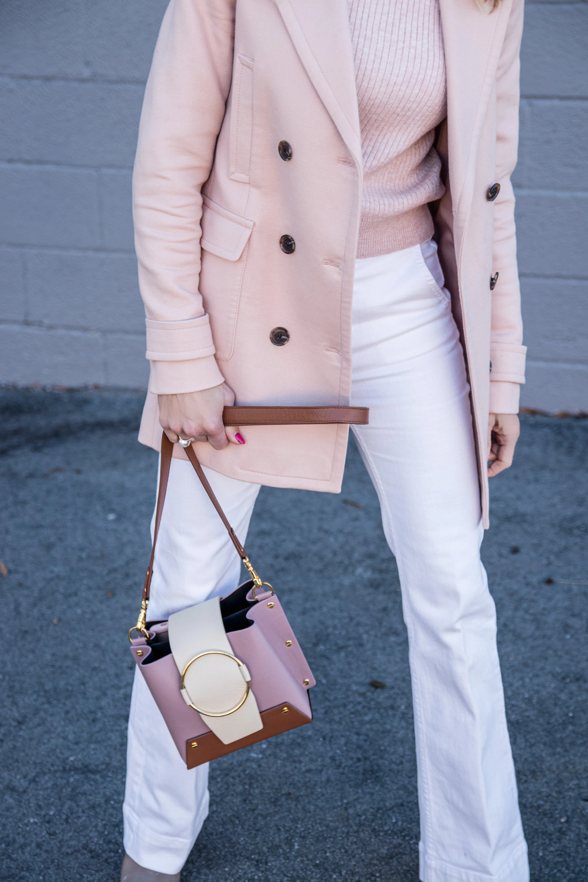 I did a little color blocking here with a pink sweater (similar) and a pink coat (keep scrolling). I paired them with off white flare jeans that I got last season at Anthropology, Frye booties (similar here) and a roomy bag that pulls the outfit together.