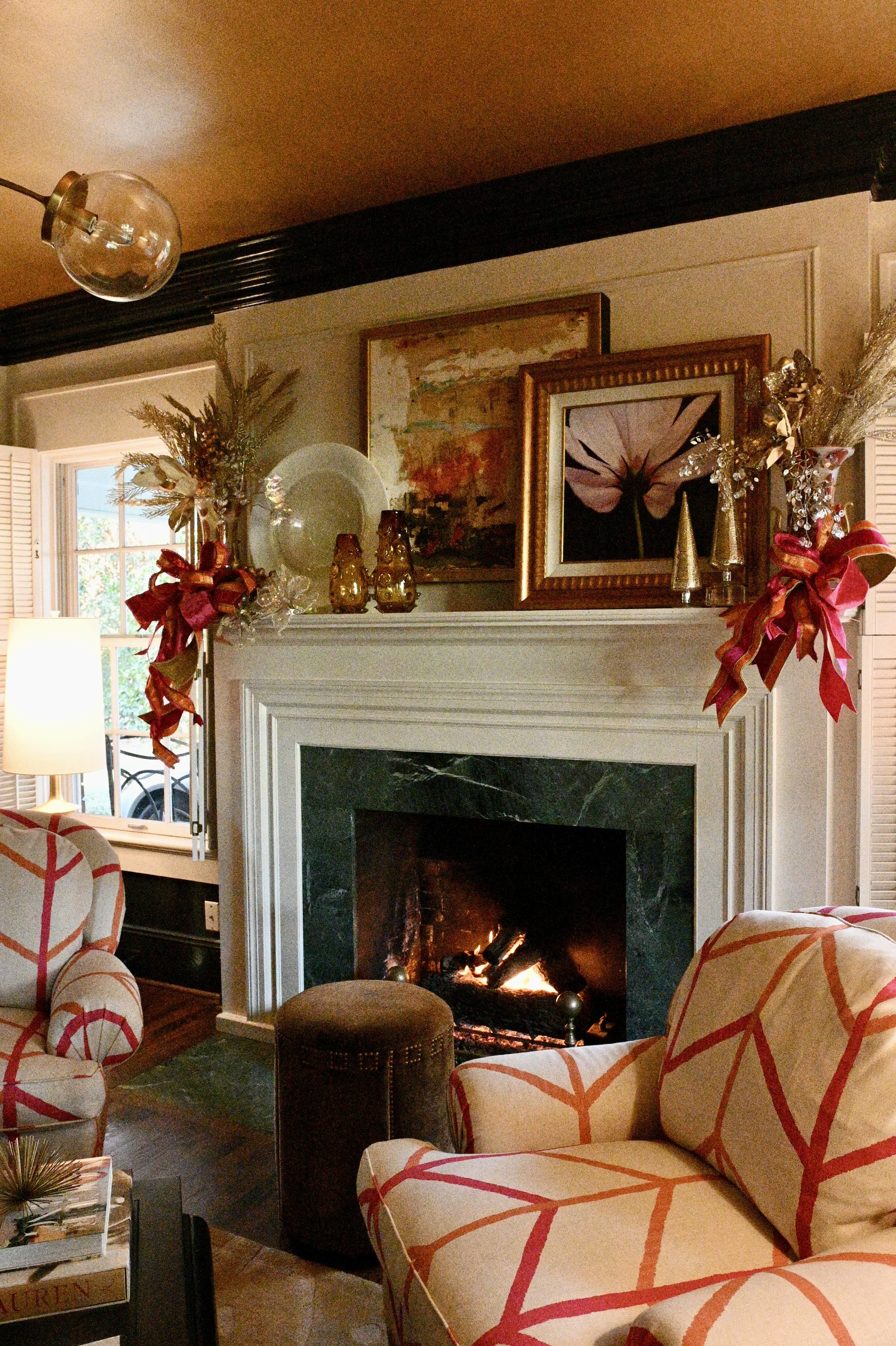 I snapped these pictures a little while ago and they’re not the best, but they give you an idea of what my mantle looks like. I found a huge box of really gorgeous pink and orange ribbon that I had totally forgotten about and we used that for the bows. I’ll add a little more when Thanksgiving is over, but I’m so enjoying it for now!