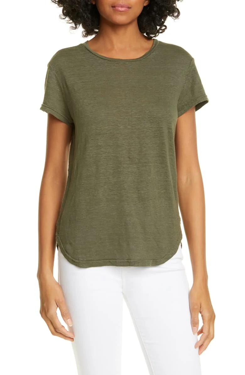 I think this olive color is great on most everyone and I love it paired with white. Itβs linen, so just a little dressier than a cotton tee and again, wear it now and throw a jacket on over it going into fall!