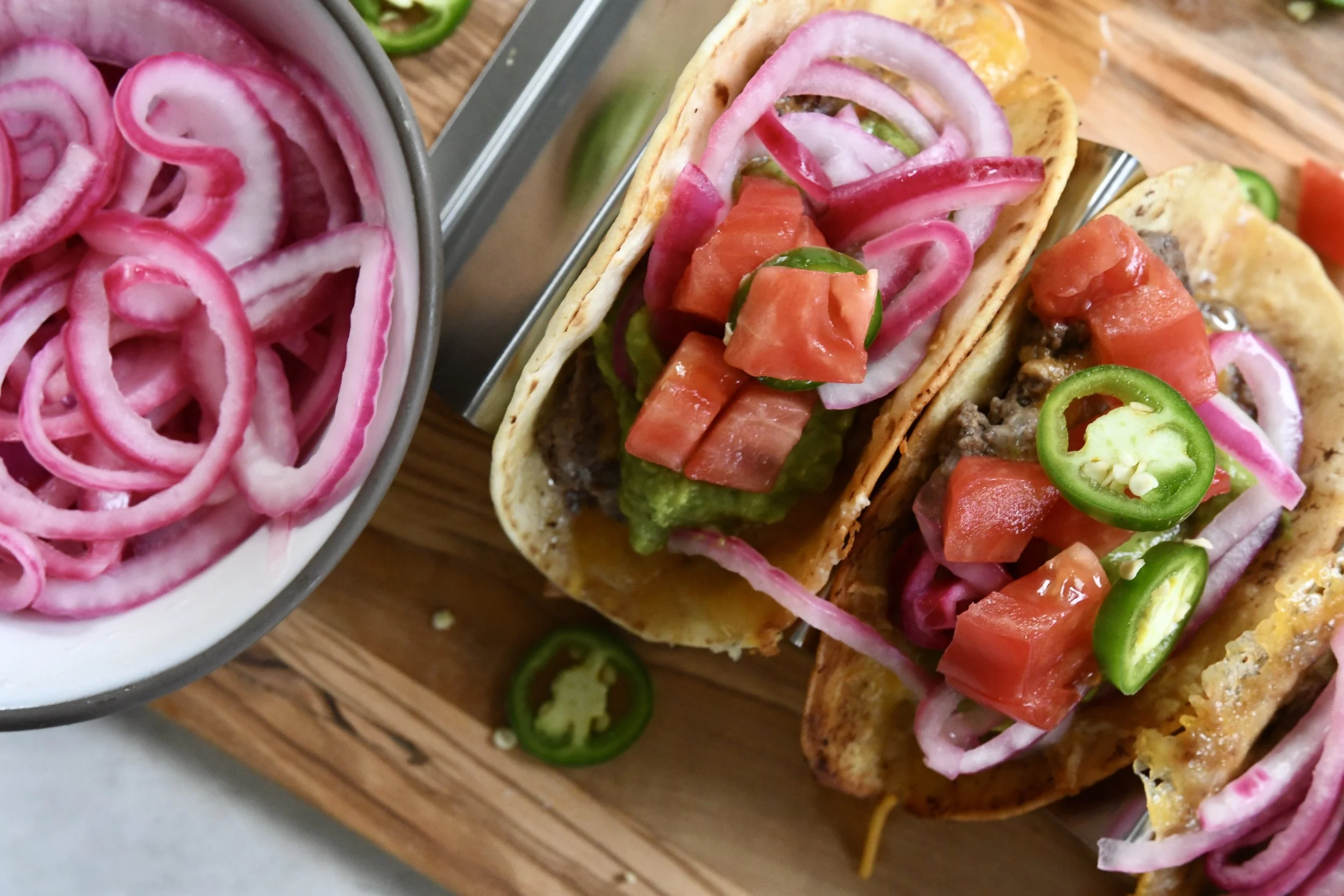 Tortilla Smash Burgers with Guacamole & Pickled Onions