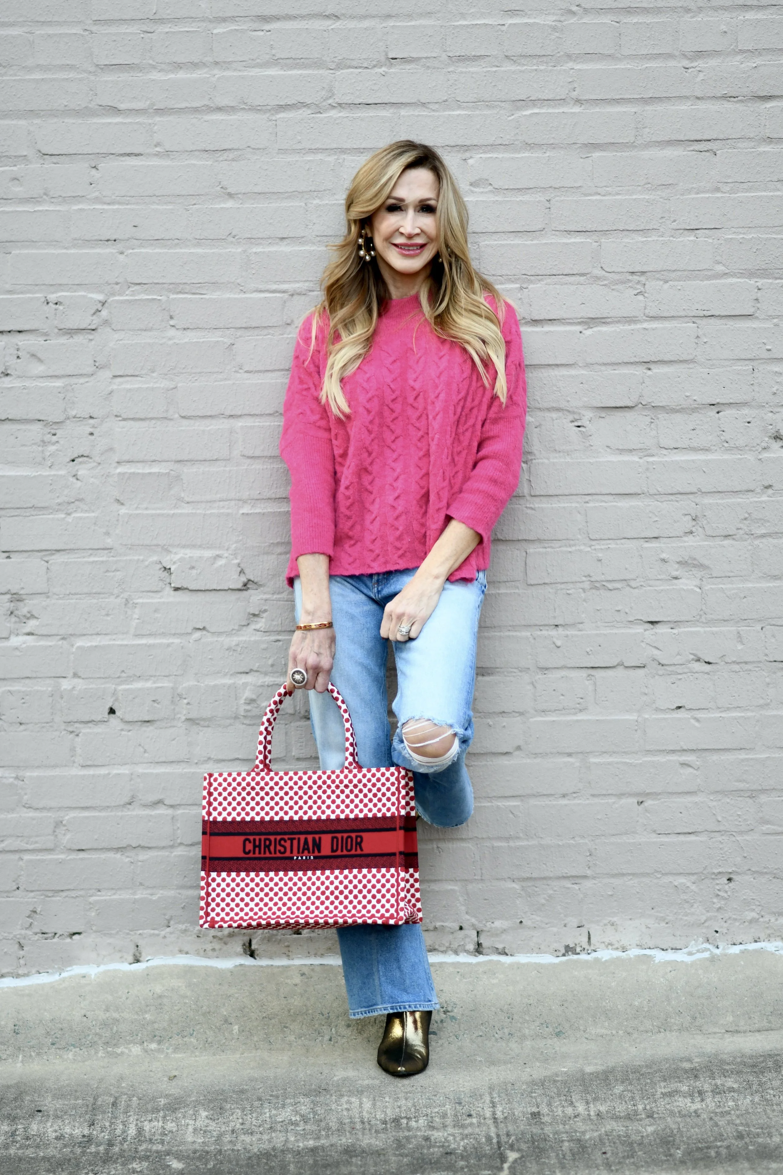 Pink and red has been a favorite color combination in our home and this outfit reflects my love of pink and red, but in an understated way! I’ve combined a pink sweater, wide leg jeans, metallic booties and a red polka dot canvas tote!