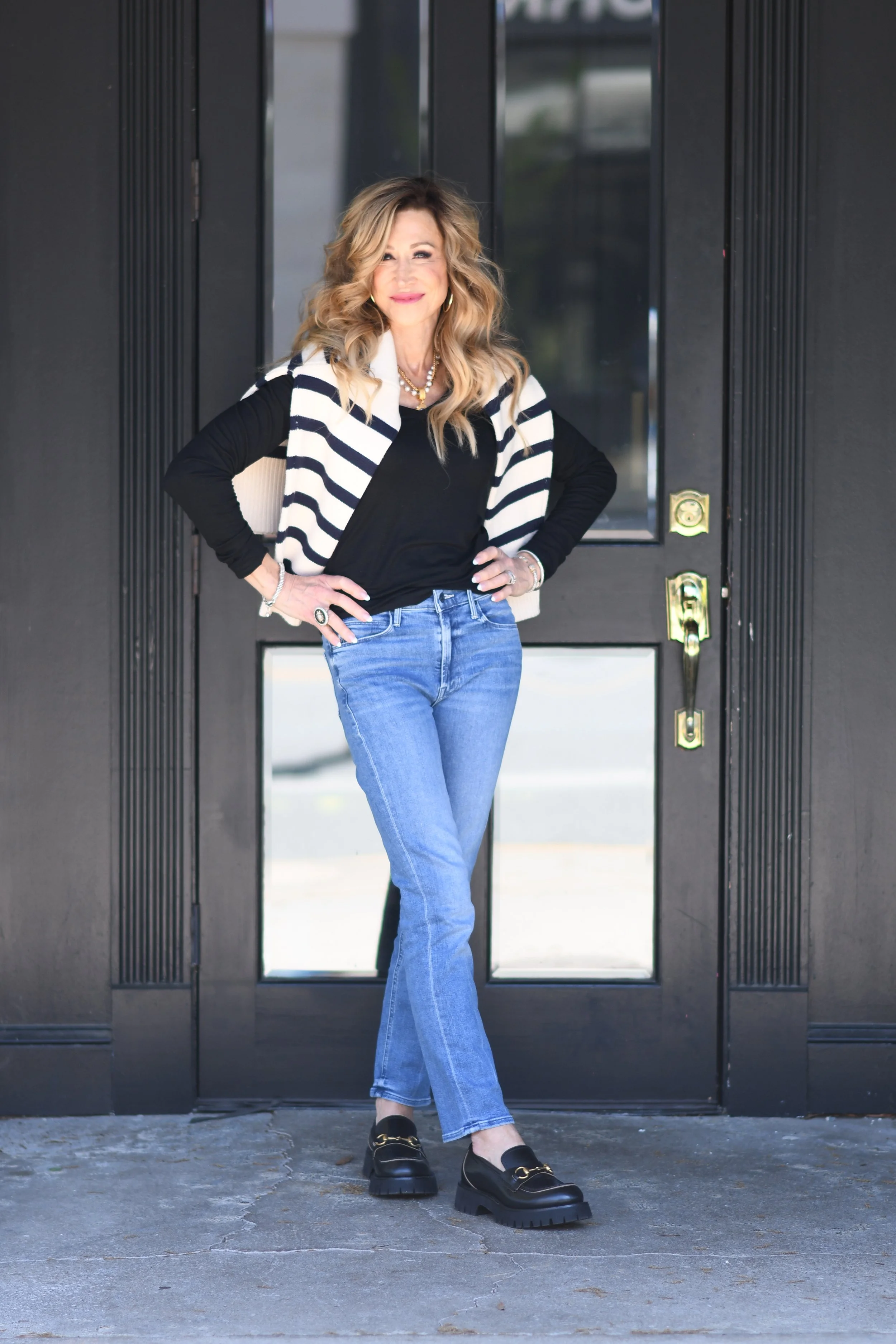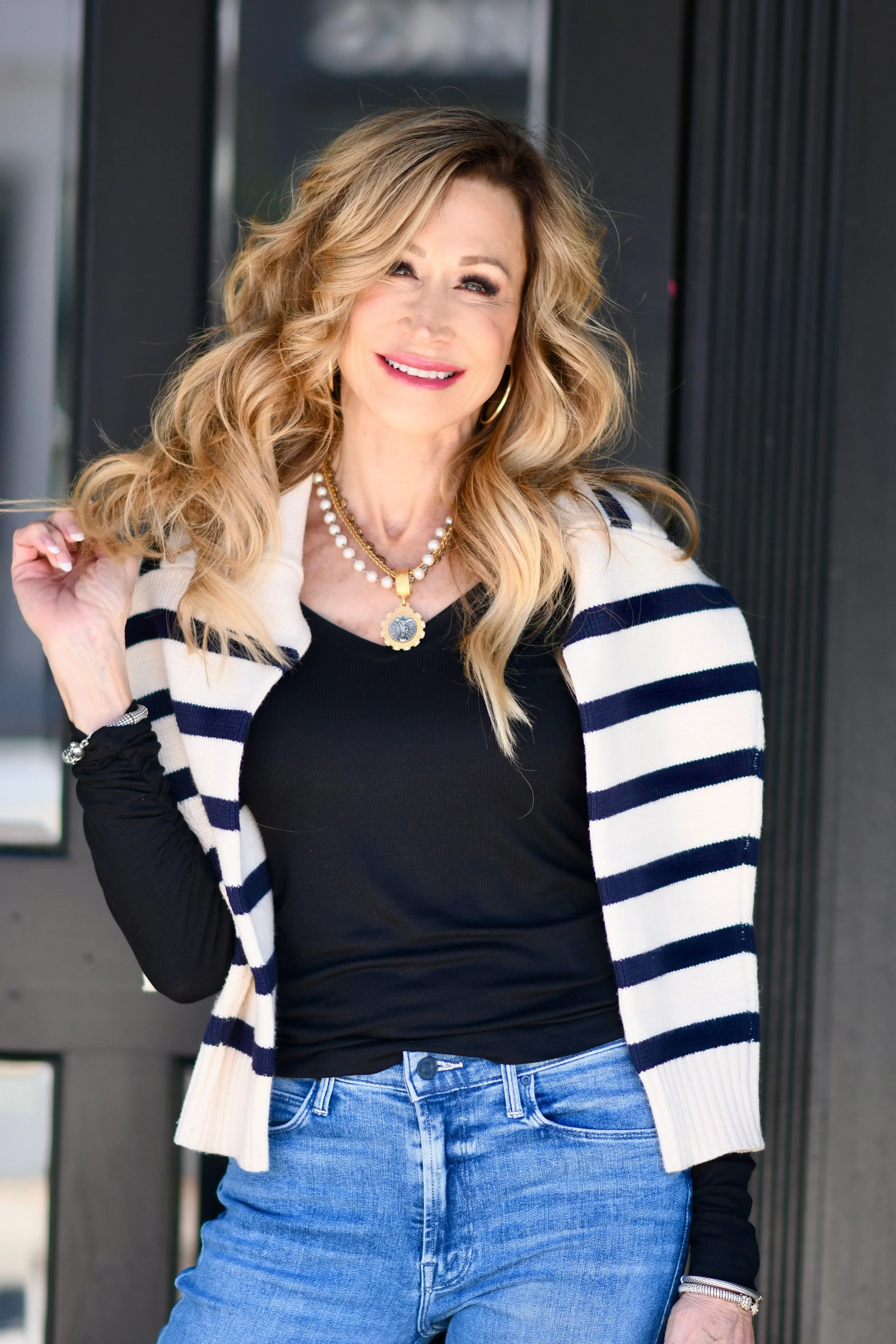 Yesterday was a day of errand running, but it was still a little cool and I didn't think just a tee shirt would keep me warm enough so I added this cute striped sweater from Zara, casually thrown over my shoulders. I got it last October when I was in Paris with my daughter (yes, I went into Zara in Paris) and I’ve worn it often! It’s thick and the quality is amazing!
