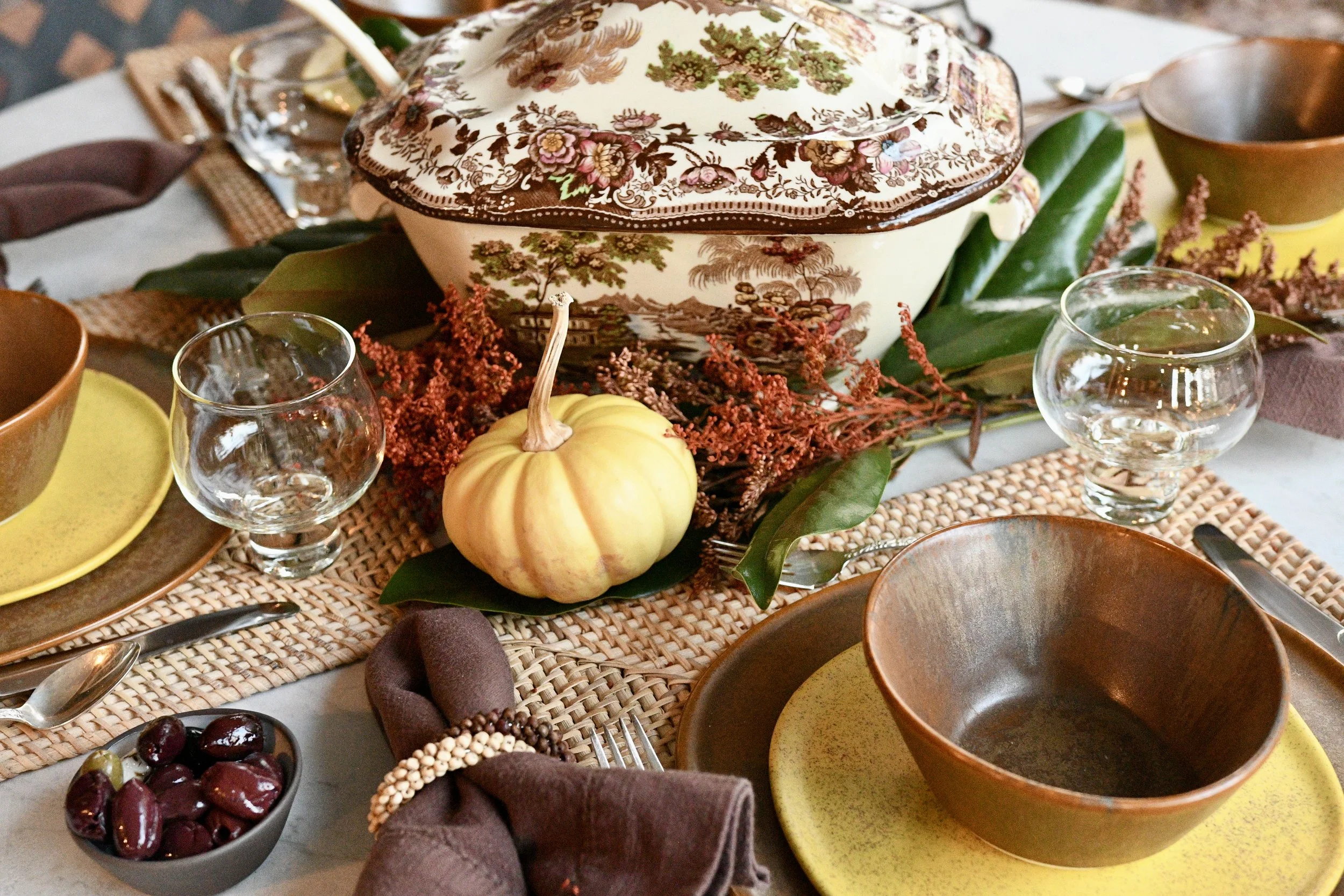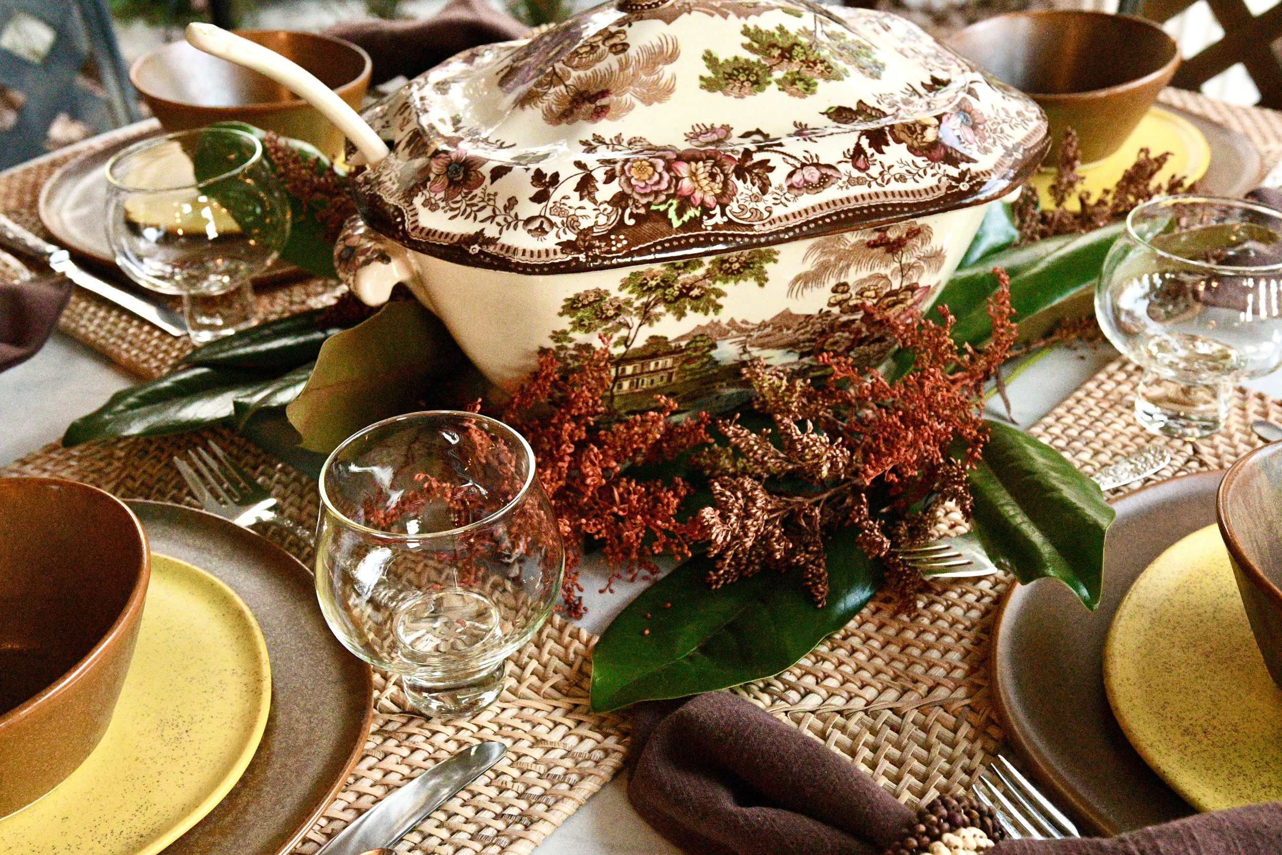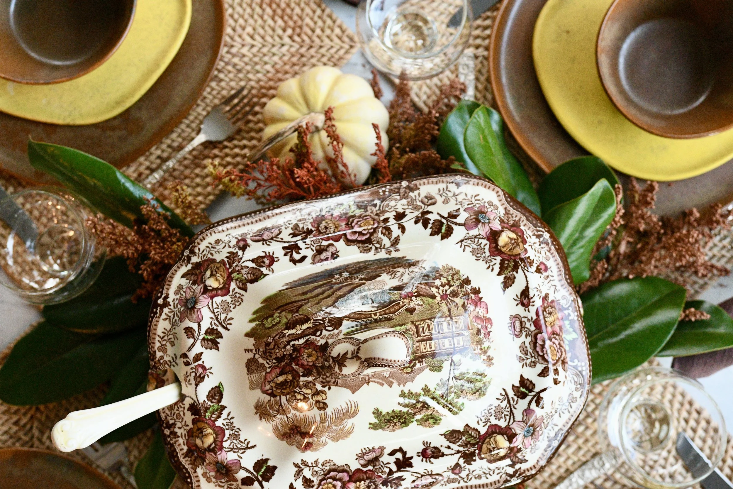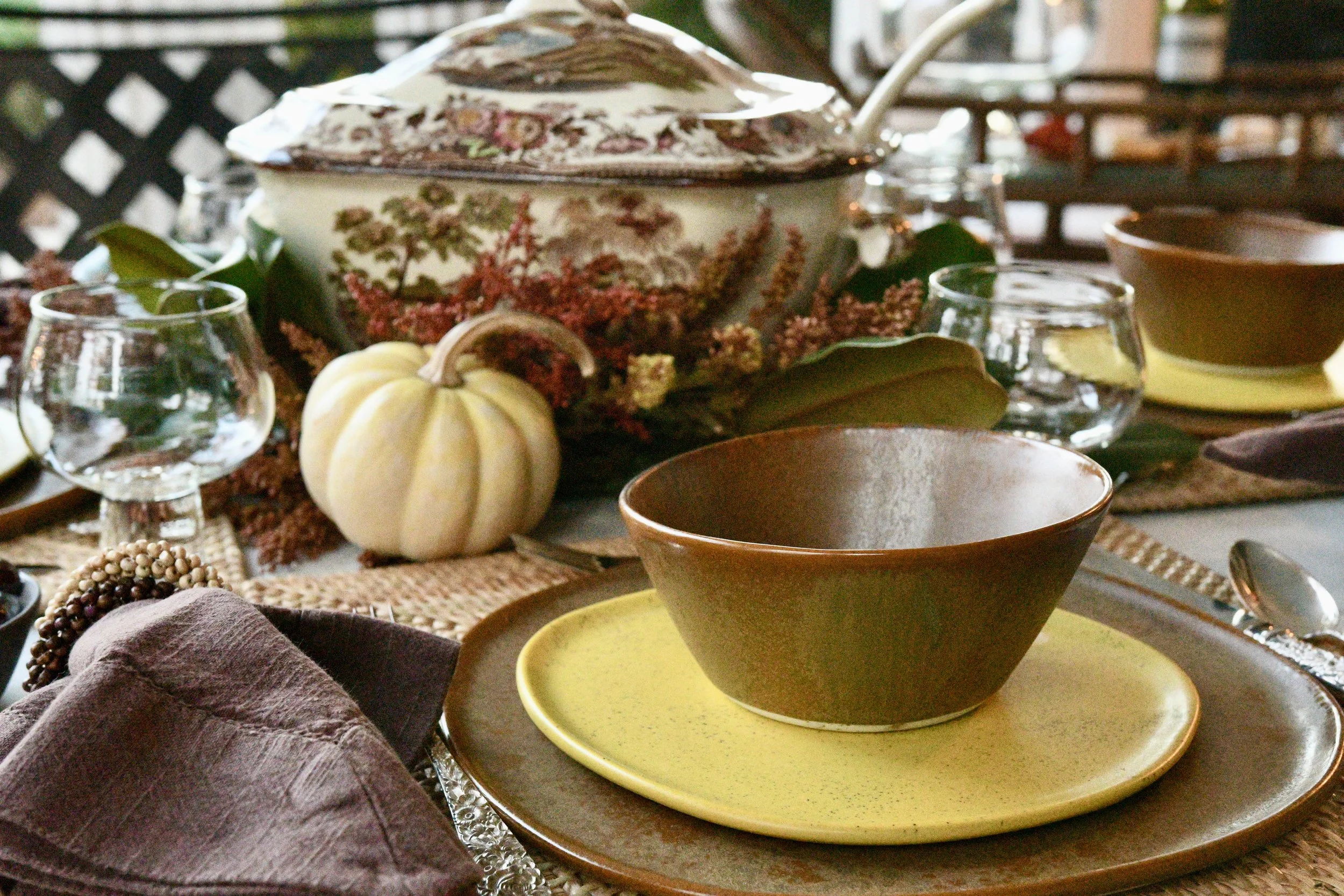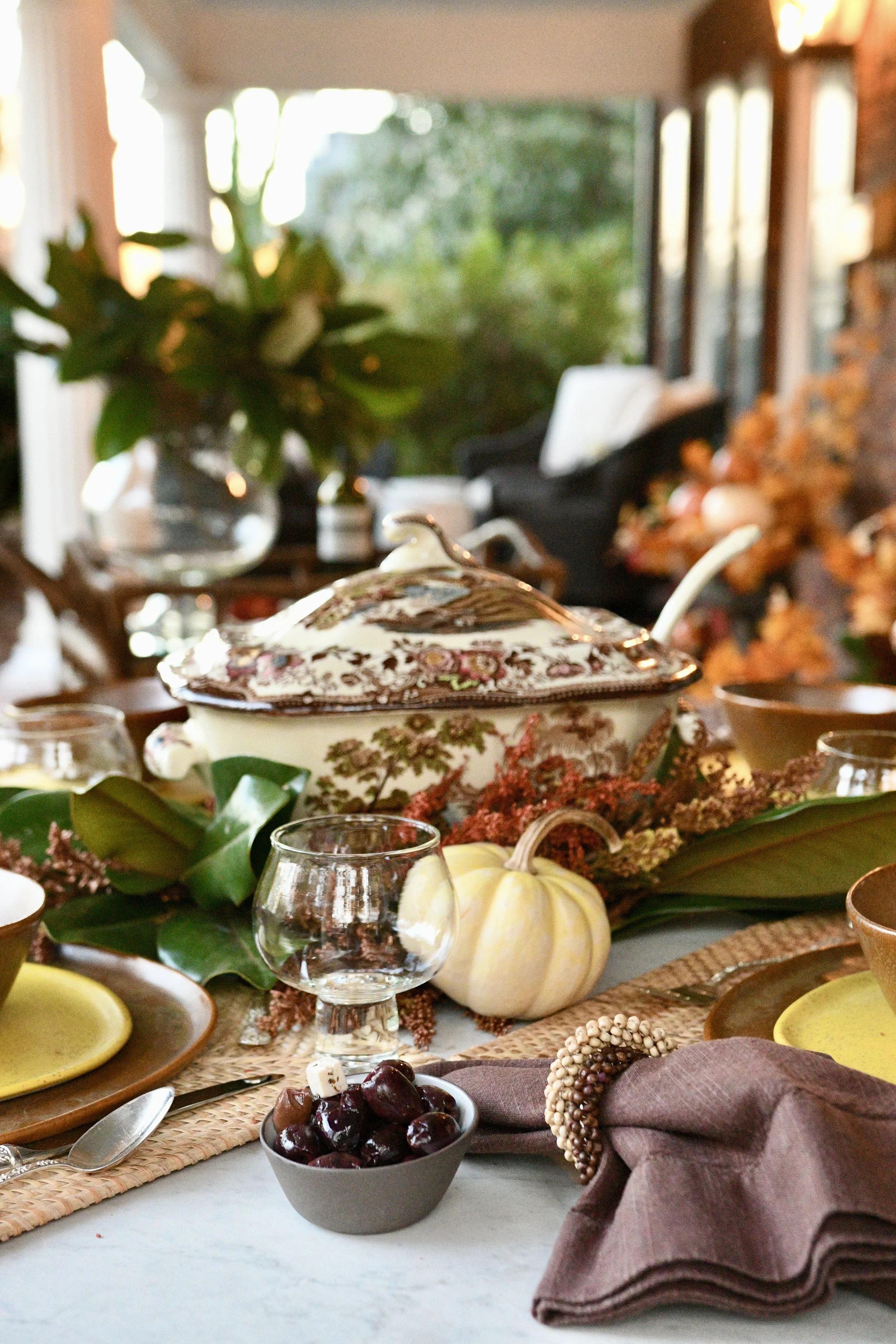 I used an antique soup terrain for the centerpiece on this table. It blended perfectly with the brown and acid yellow dishes from Haand. I added grocery store flowers, magnolia leaves and pumpkins to fill the table. The napkin rings remind me of acorns wrapped around brown linen napkins and the flatware is my silver Repousse. Each place setting is set on a square placemat from Williams Sonoma. I love the way this turned out and I think it’s so perfect for a Southern front porch!