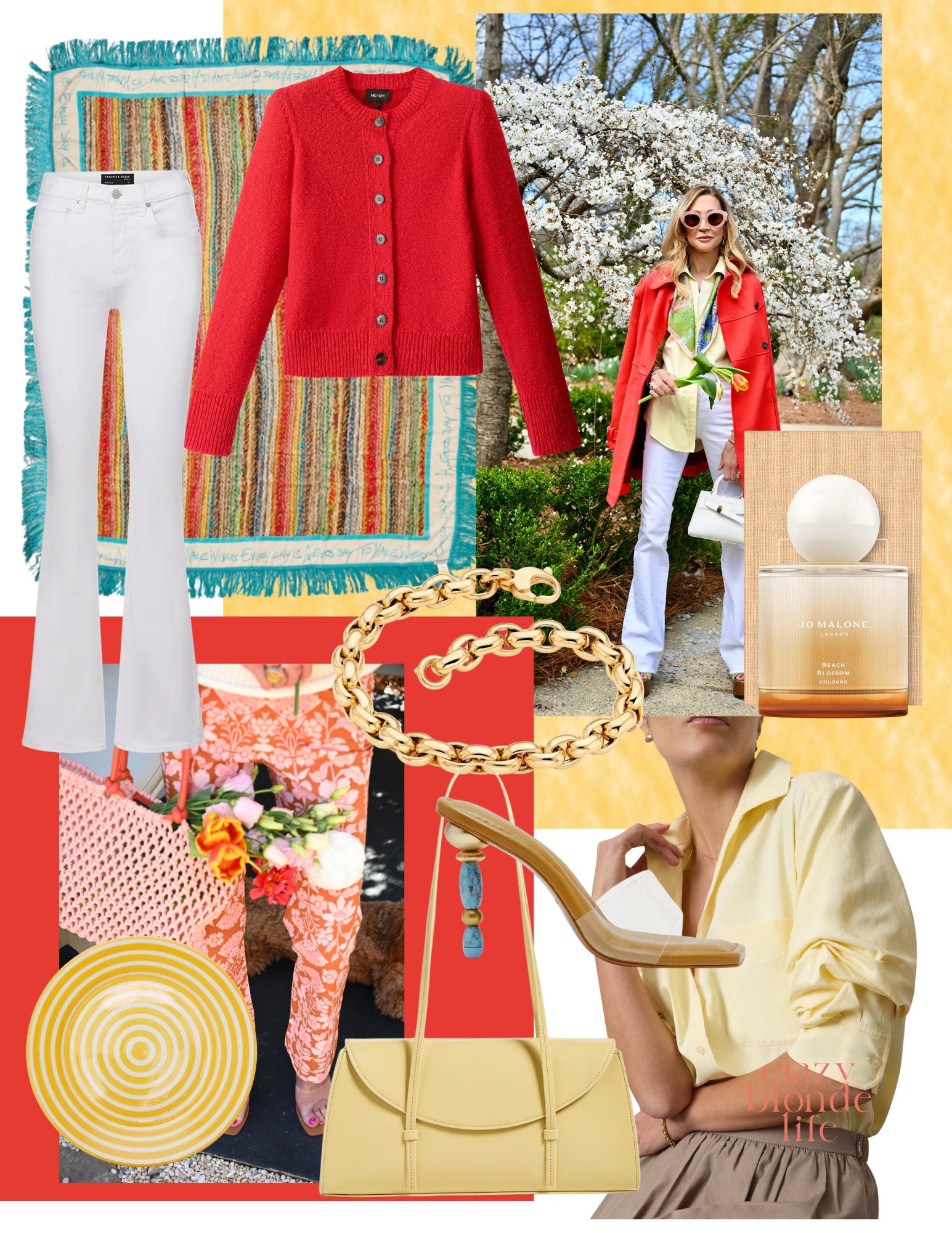 If you know me, you know I'm a big fan of Brochu Walker, and their shirting is the best I've found. This butter yellow blouse is surprisingly perfect with the red swing coat, and the scarf from Benaar LA just brings everything together. I've added a fabulous green beaded necklace from Julie Vos, and my shoes are green suede Gucci sandals I picked up last fall, but there are so many options that would work here, including these from Cult Gaia.
