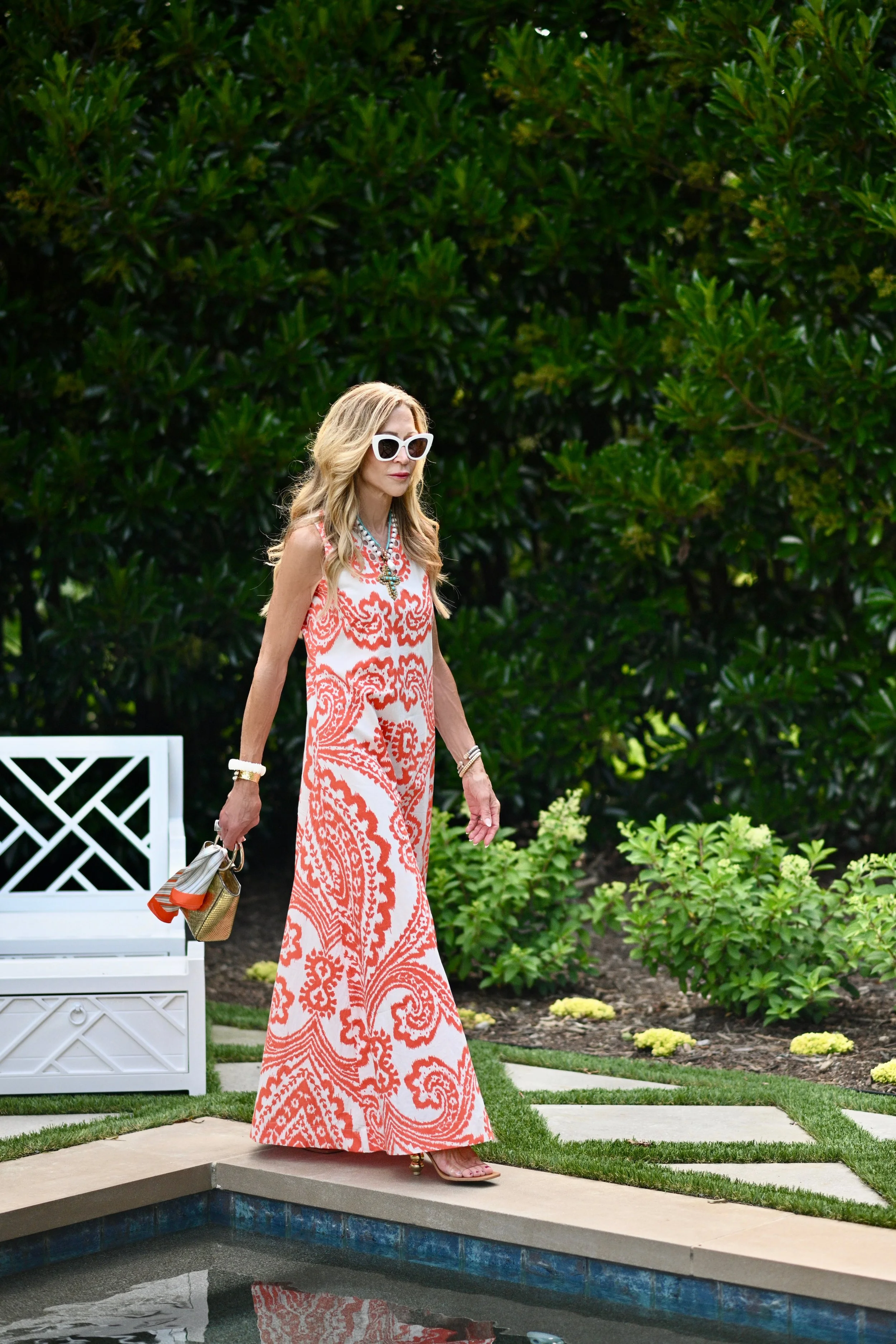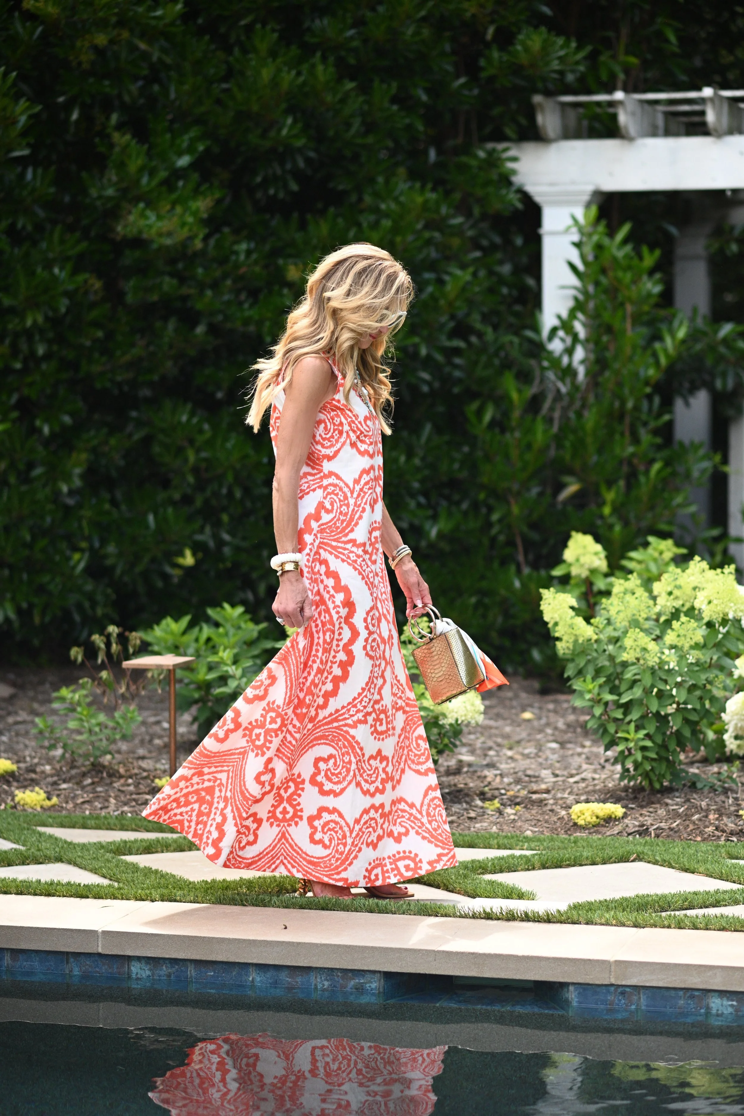 Every dress from Just Darviny is my favorite, and this fabulous orange Ikat print dress is just too fabulous! I love orange and this bold and breezy dress certainly makes a statement! This sleeveless maxi showcases a hand block-printed ikat pattern in vibrant orange on soft, breathable cotton. This chic dress is a perfect choice for sunny escapes, brunch dates, and everything in between. White embroidered detailing around the neckline adds a touch of elegance! Youβll want to wear this dress everyday!