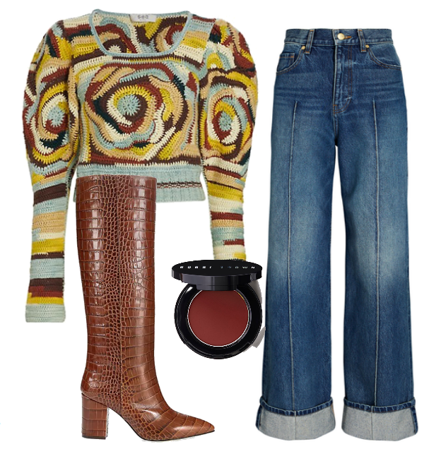 The jeans pictured here are fabulous if youβre tall. I ordered them and they are too much for my small frame but they would be amazing on my daughter who is 5β8β! Iβm pretty obsessed with the sweater which would be amazing with any high waisted pants!