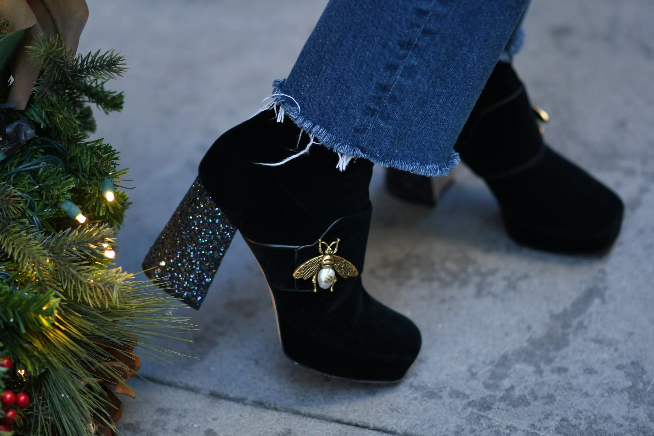 When I started packing for this trip, I knew I wanted to pack a few outfits that were festive without being over-the-top red and green. I decided to pack a fur coat that belonged to my mom. Itβs a beautiful coat and it fits me perfectly. Itβs styled like a bomber jacket, so itβs a bit more casual that a more traditional fur coat, making it perfect with jeans. I wore the coat all day long on Saturday styled with jeans, a camel cashmere sweater with a statement pearl necklace, straight leg jeans, my favorite red bag from Tory Burch and some really sparkly Gucci boots that Iβve had for several years. I got so many compliments on my outfit and I stayed warm all day long.