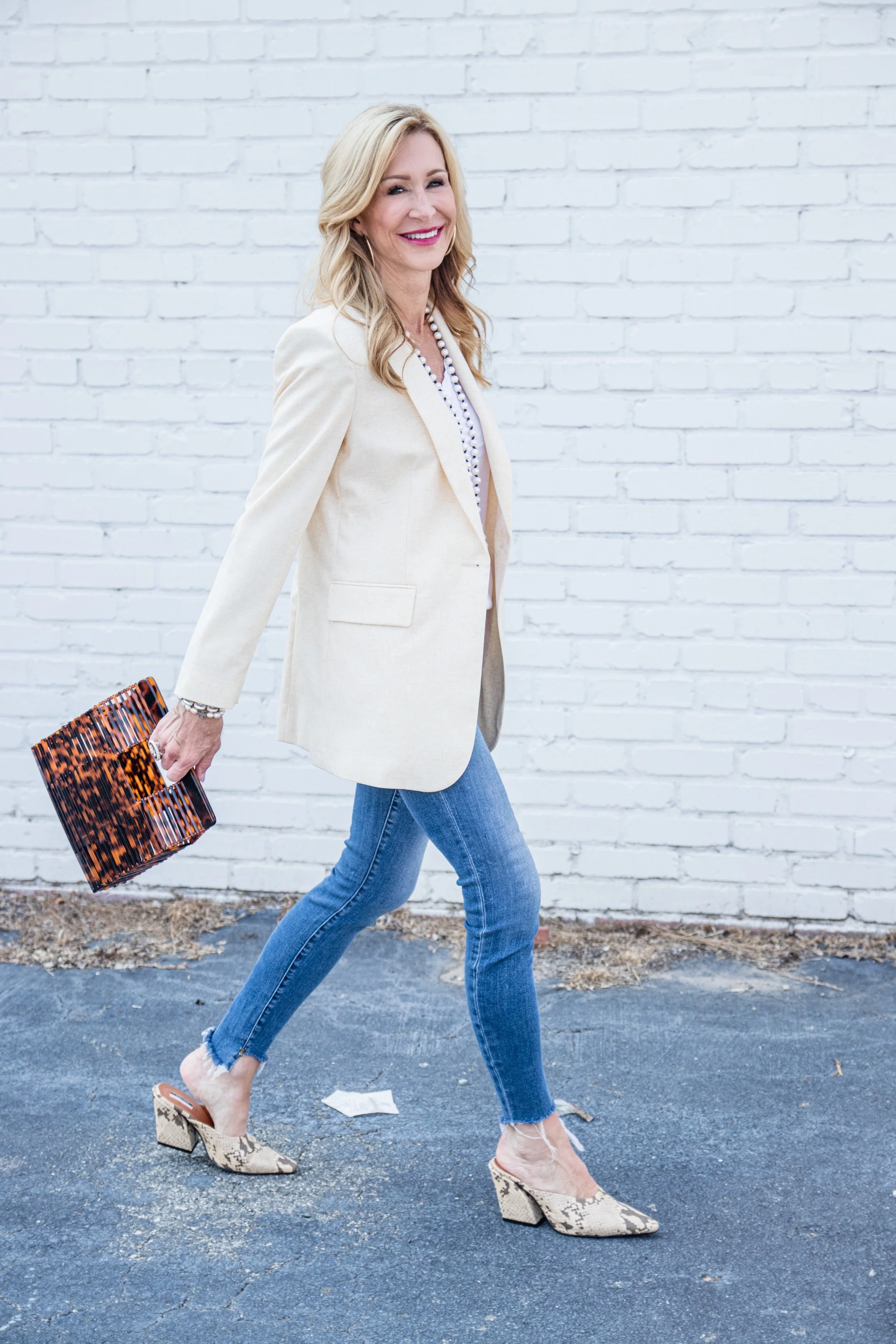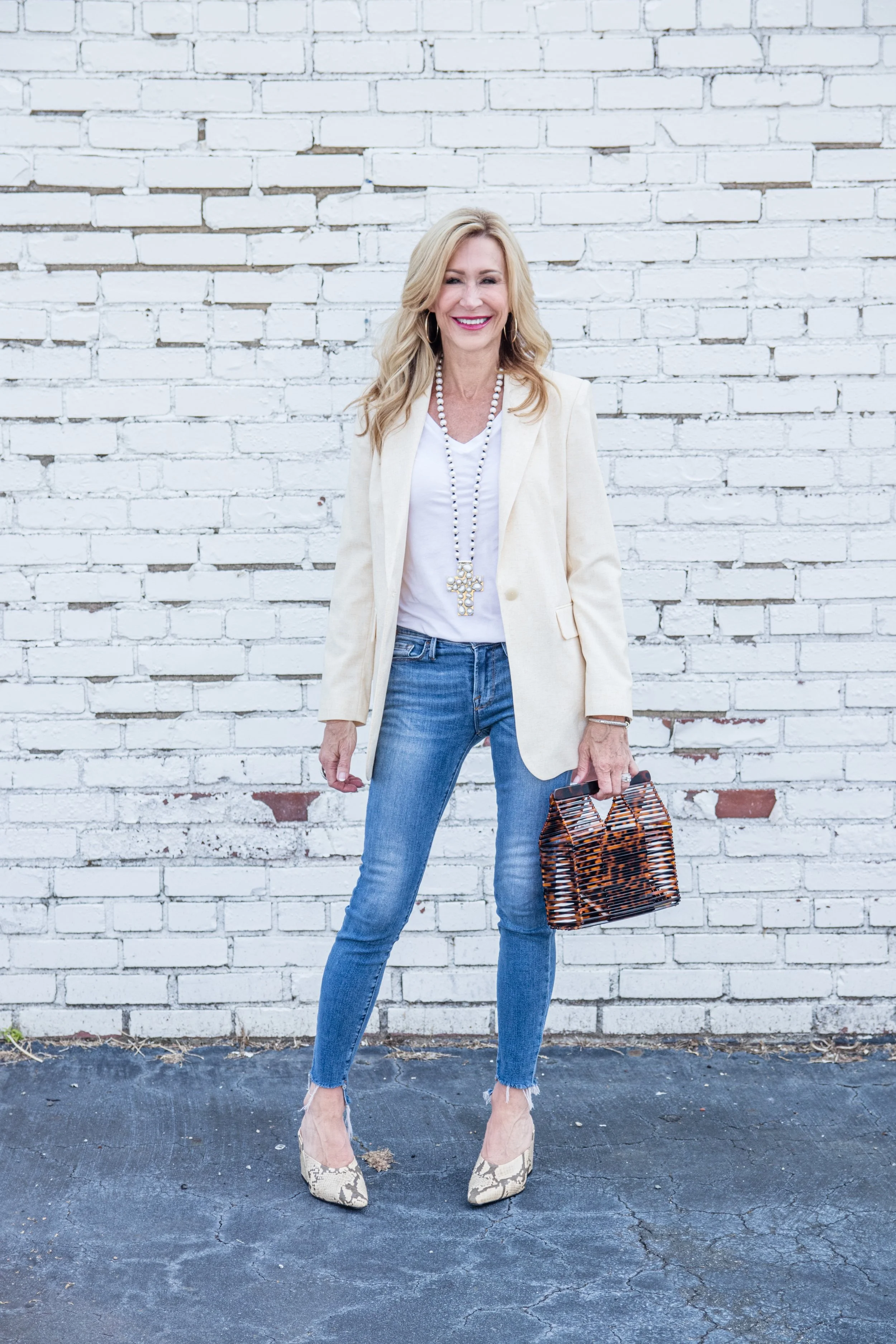The very versatile and lightweight blazer that Iβm wearing is from Mango, the jeans are Frame Denim, the shoes are from Zara (no longer available) and my bag is Cult Gaia. Iβm wearing it with my lucky cross necklace from Julie Miles. This outfit is one of my favorites right nowβ¦itβs neutral, goes anywhere and I think looks polished, but itβs sooo simple!