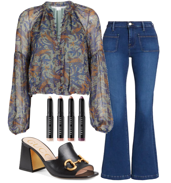 The neckline and puff sleeves on the shirt above makes it a little harder to layer, but I would most definitely trade out the sneakers for a pair of Marc Fisher booties!