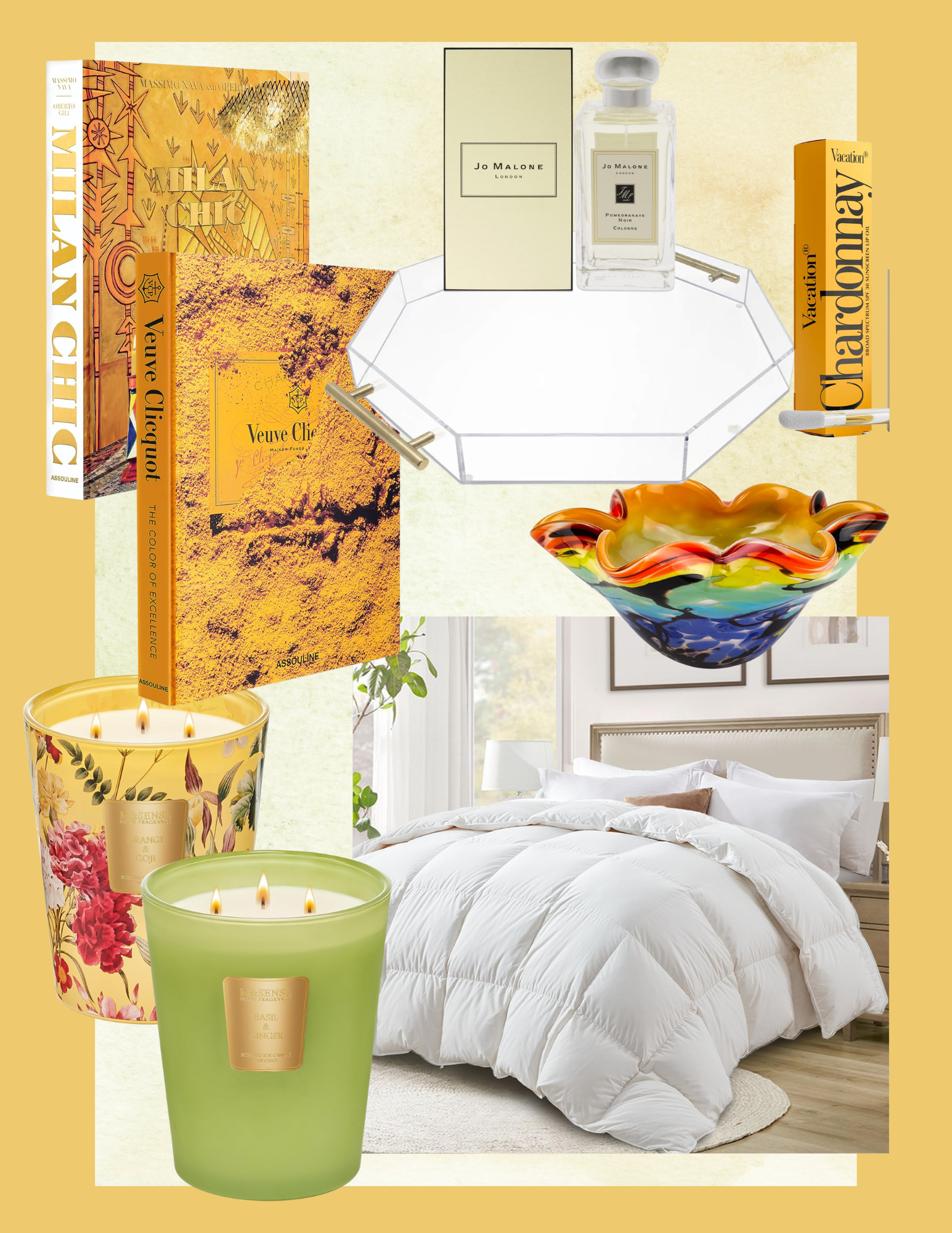 //Milan Chic Book//Veuve Clicquot Book//Jo Malone Pomegranate Noir (my forever favorite scent)//Acrylic Tray//Chardonnay Lip Oil//Murano Glass Bowl//Duvet//Candles (this candle comes in many different scents so be sure to scroll down to see the all)//