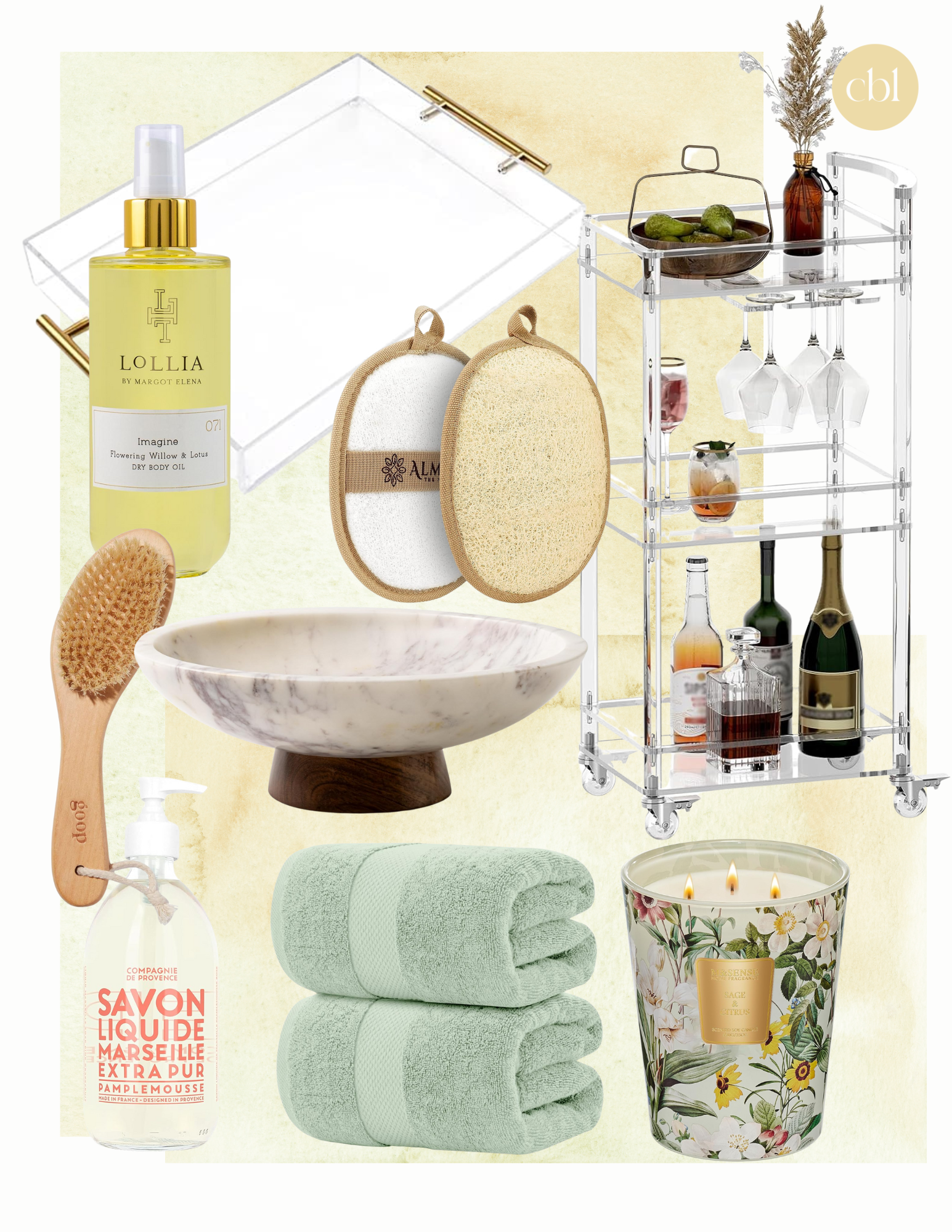 //Rectangular Acrylic Tray//Lollia Body Oil//Loofah Sponges//Bar Cart//Decorative Bowl//Dry Brush//Grapefruit Hand Soap (I love the scent of this soap and that it comes in a glass bottle)//Green Bath Sheets//Scented Candle//