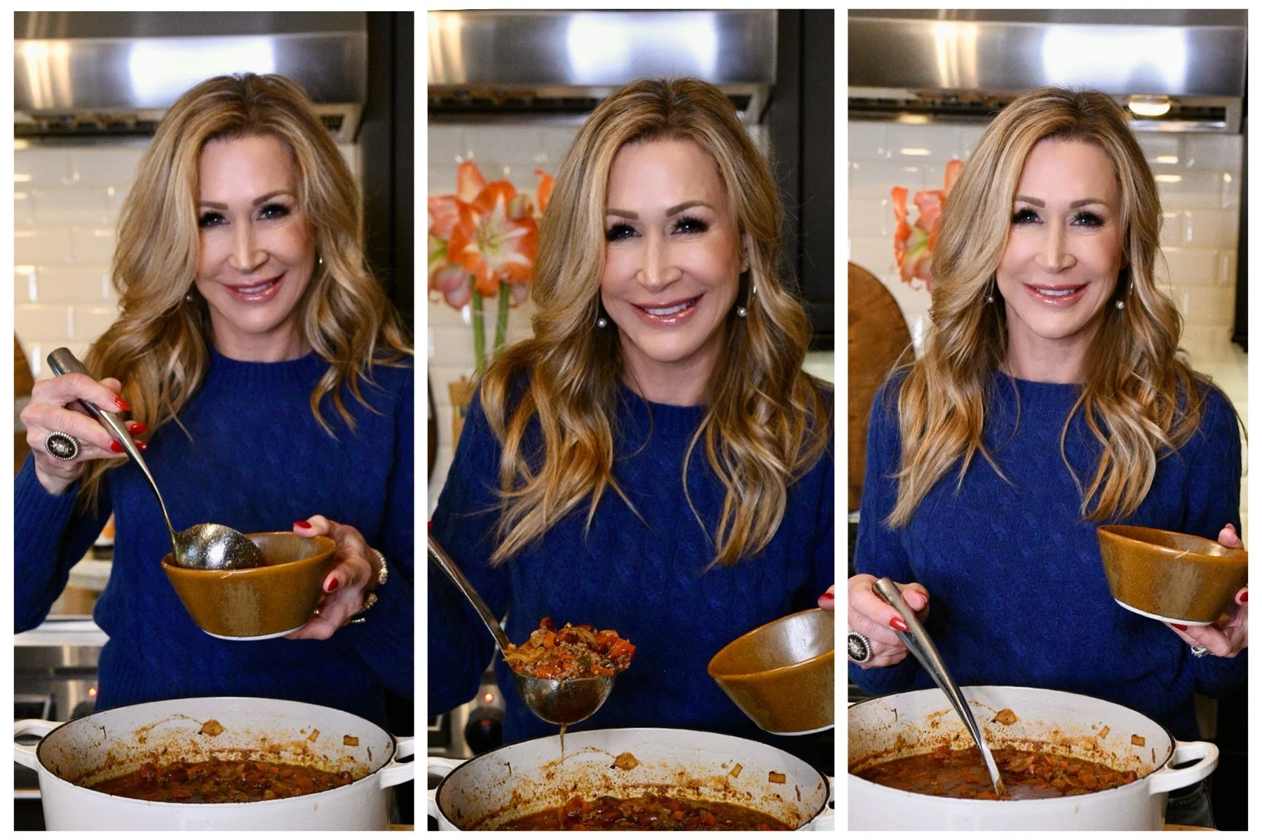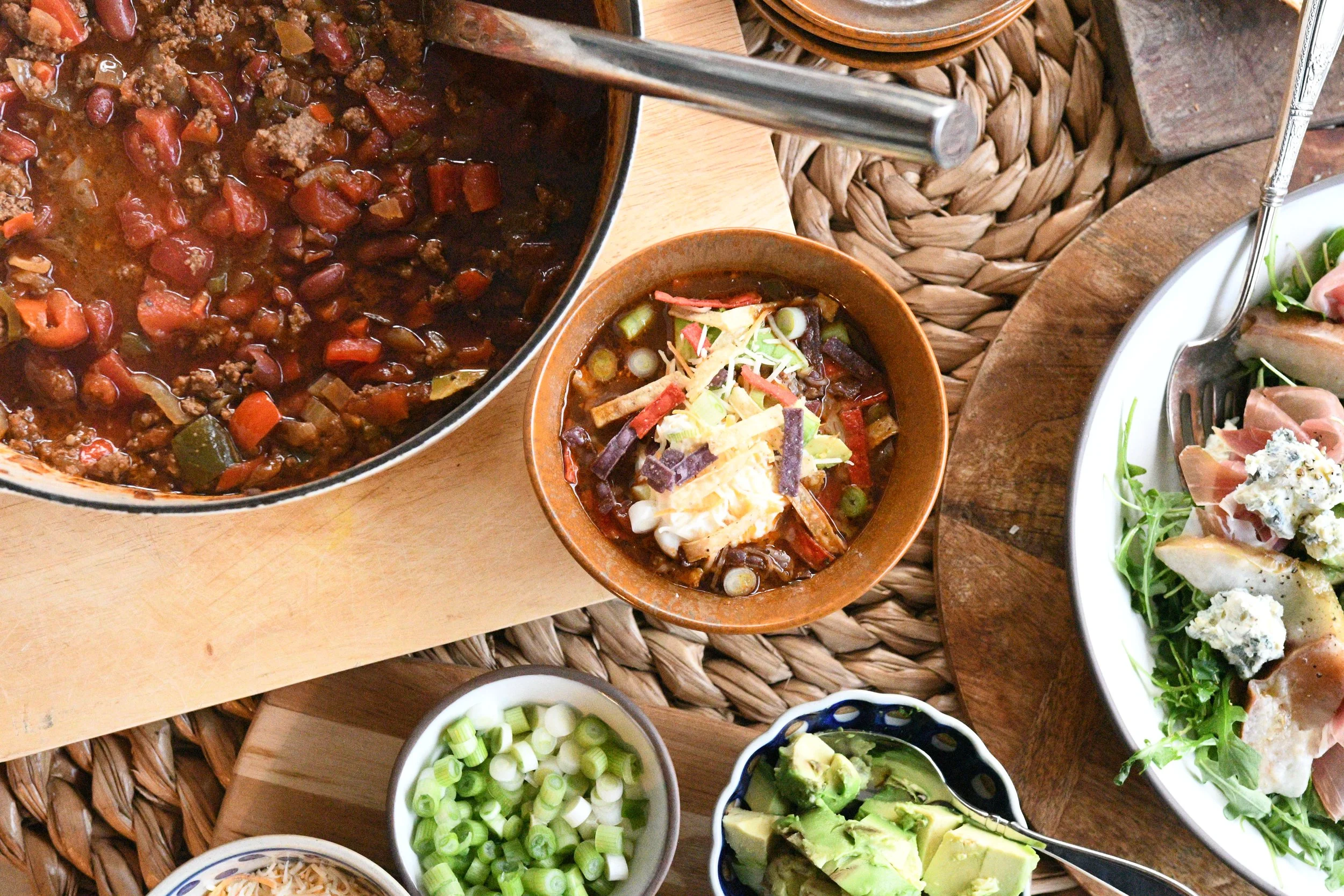 Start by sautΓ©ing onion with jalapeΓ±o peppers, red peppers and garlic. Add your ground beef and spices, Worcestershire sauce, diced tomatoes, tomato paste, chicken broth, kidney beans and bay leaves. Let the mixture simmer for about an hour to let the flavors meld together and serve with toppings in little bowls so everyone can create their own flavor combination! Add a delicious salad and some warm crusty breadβ¦this meal feels like a big hugβ¦itβs so good!