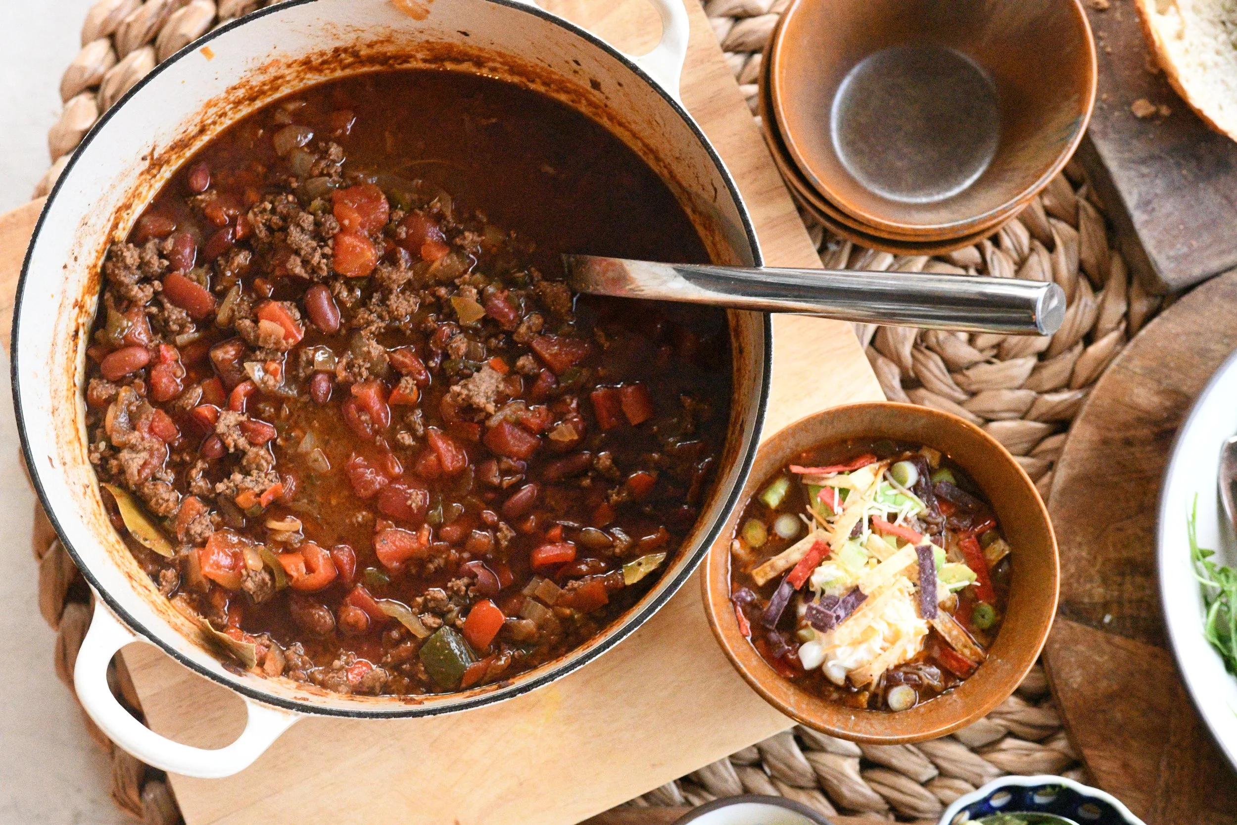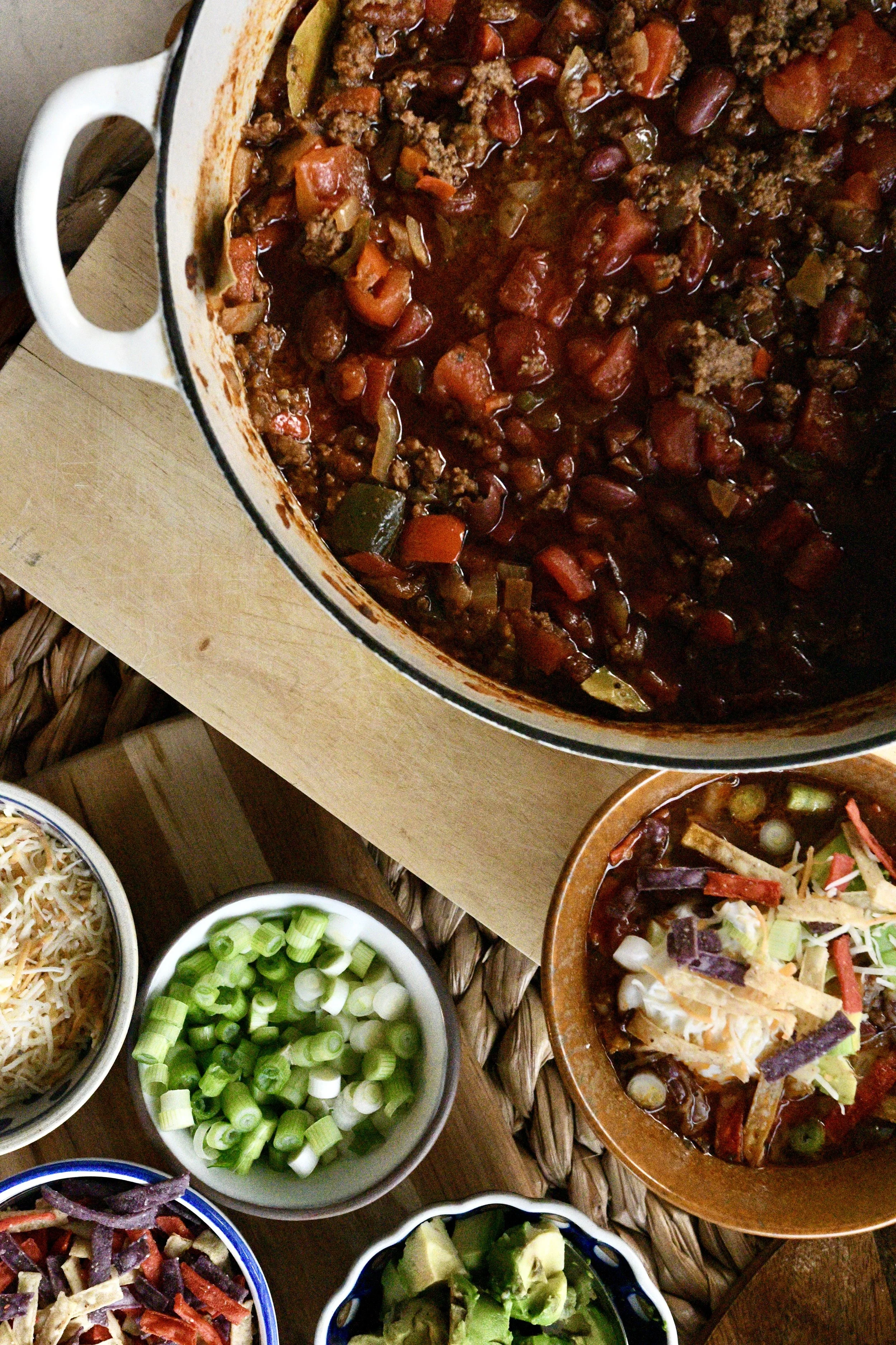 The longer this chili simmers, the better the flavors get and itβs also so delicious the next day and freezes well! For the toppings, I used avocado, grated cheese, crispy tortilla strips, scallions and sour creamβ¦the more toppings, the better!