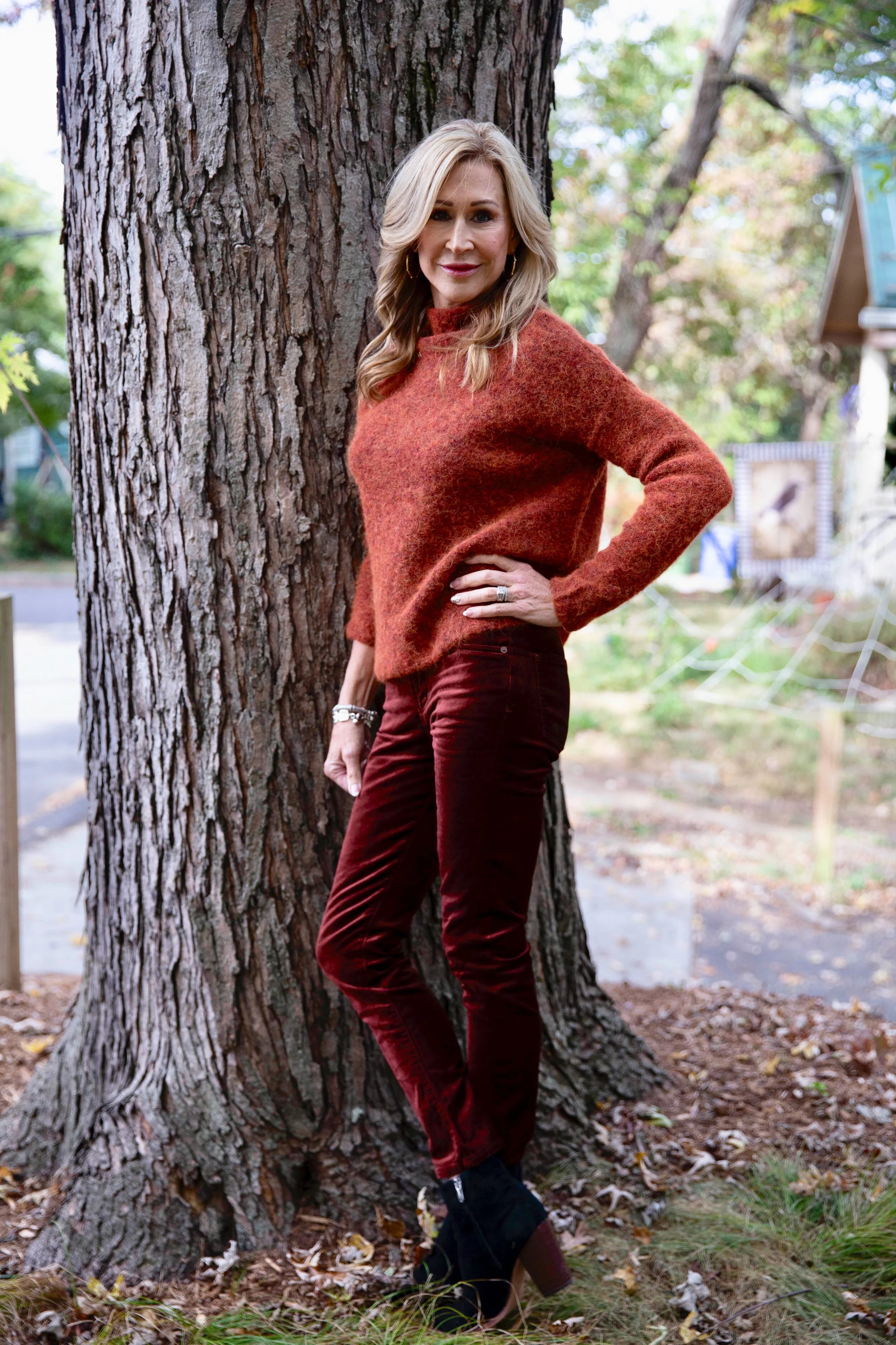 In the first few pictures, Iβm wearing a fabulous pair of velvet pants from Citizens of Humanity with a blouse by Ulla Johnson, who is one of my favorite designers and then Iβve paired the same pants with a cozy sweater for a completely monochromatic look. Iβve been loving this beautiful mahogany color lately because it feels so rich and yummy and perfect for fall!