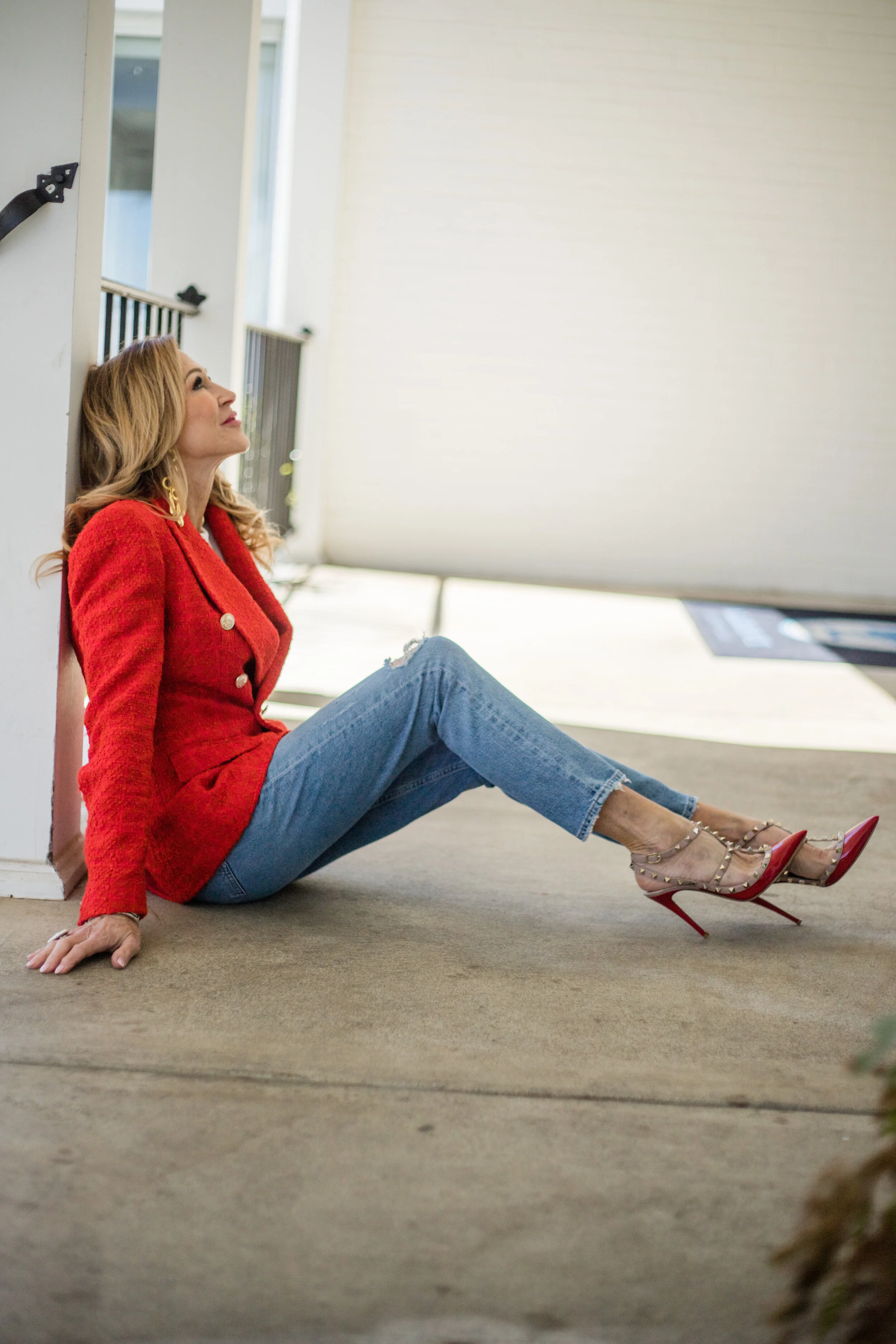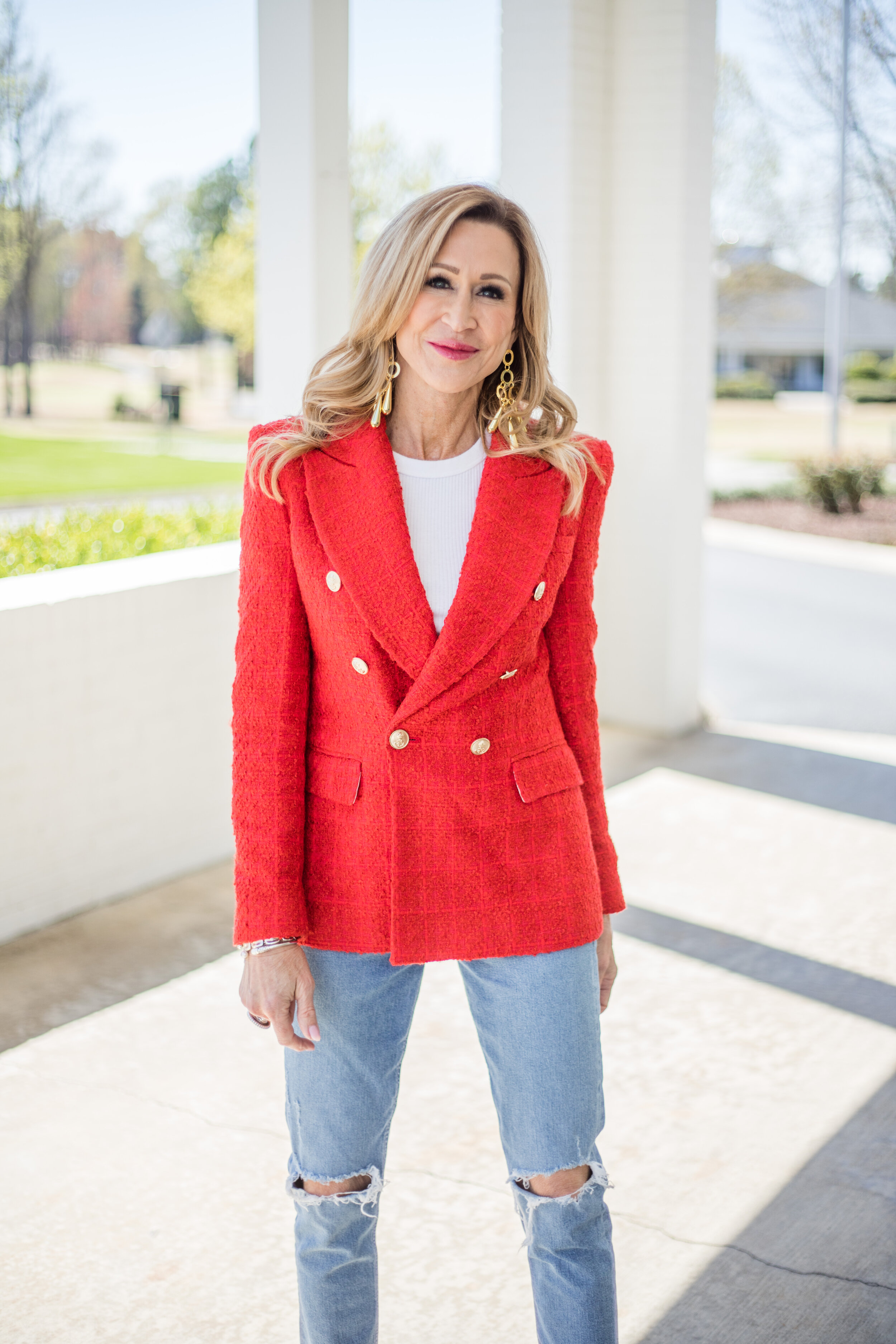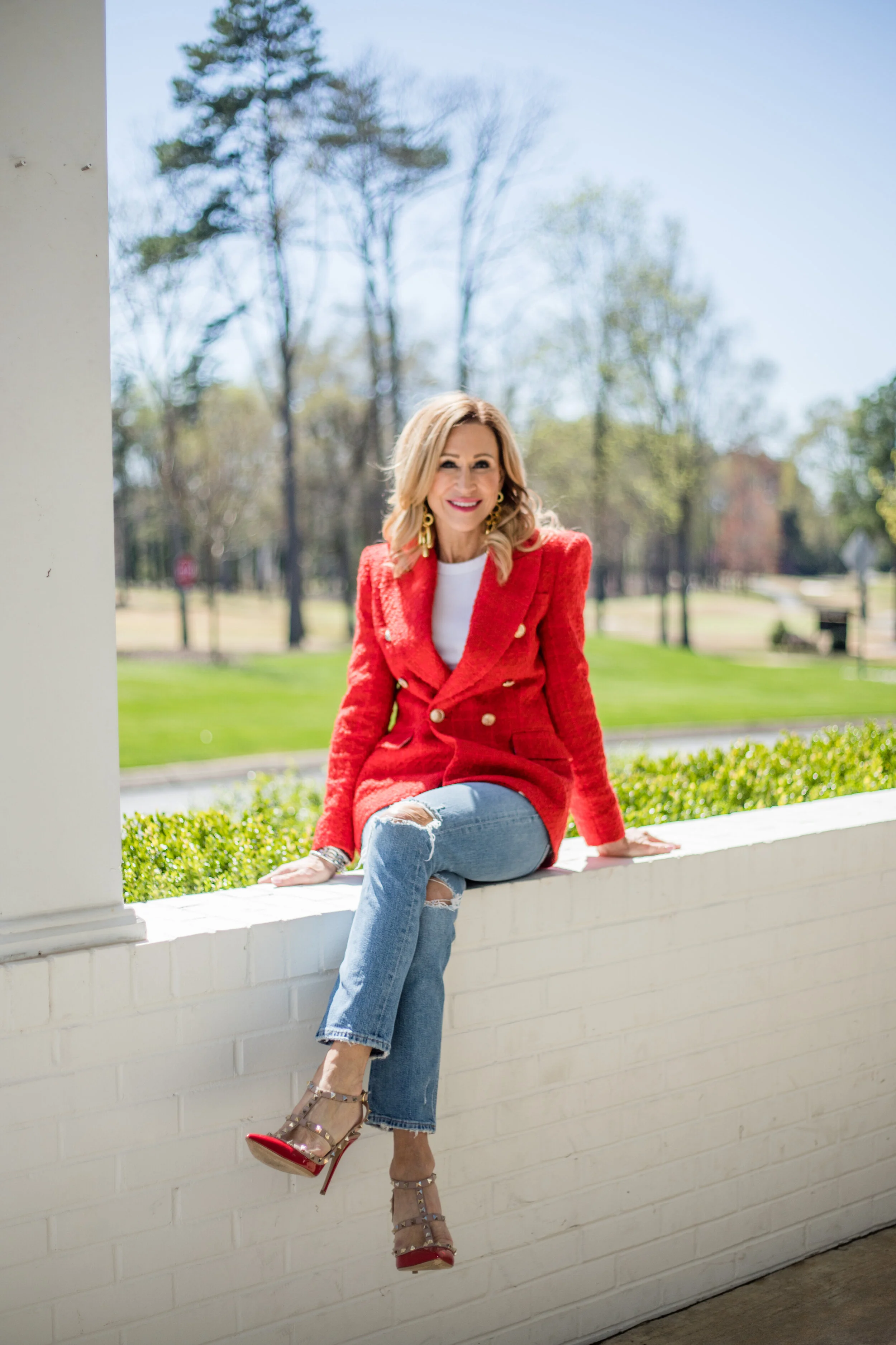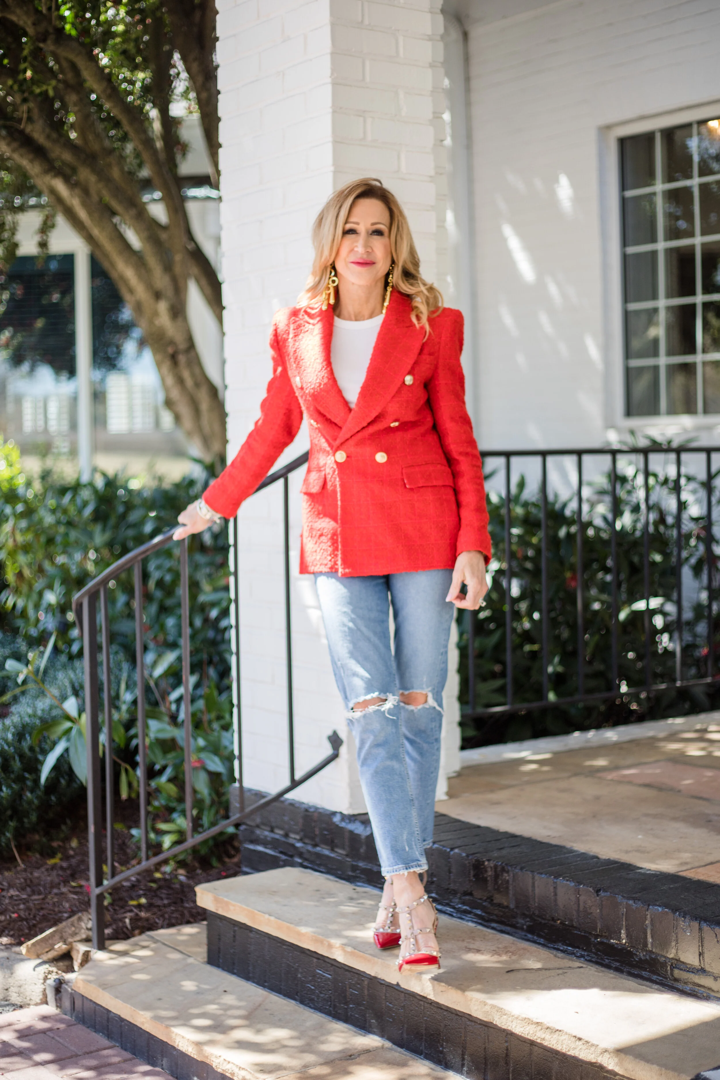 I’ve paired the show stopping red blazer with my very old, but still beautiful Valentino Rockstuds, Citizens of Humanity jeans, and a white tee from Target! My crazy big chandelier earrings are from Cult Gaia. I think they’re the perfect accessory for spring with any outfit!