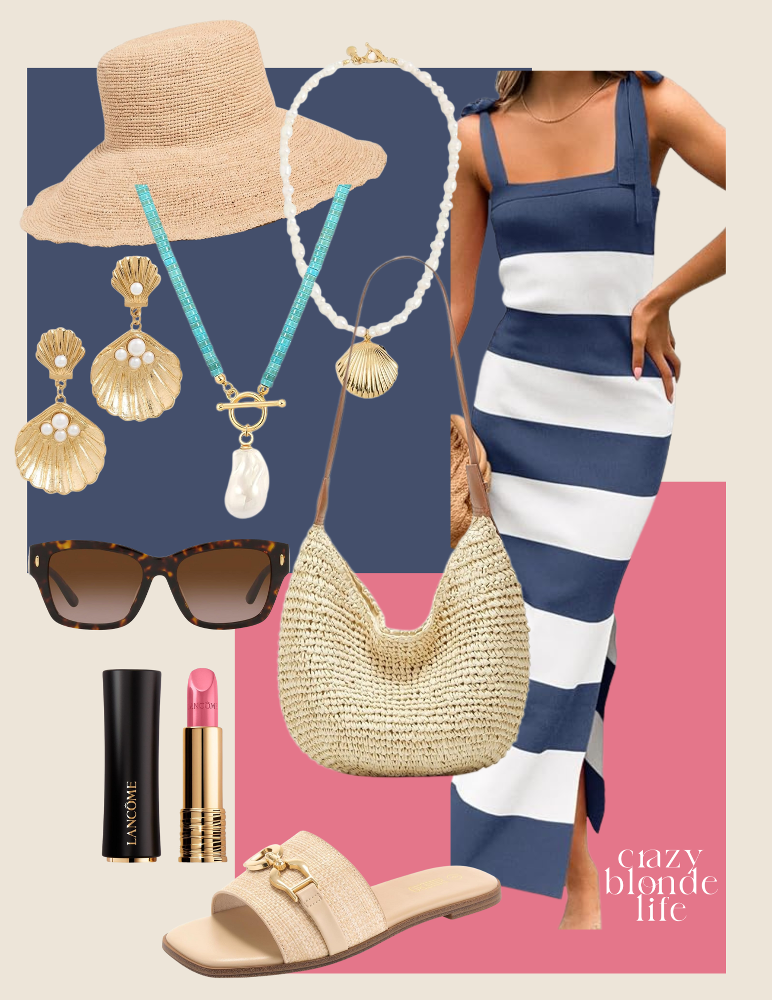 This dress is perfect for a casual date night or Sunday brunch and I just can’t get enough of bucket hats this season…I have 5 new ones because they fit my head so well! Seashell jewelry, pink lipstick and tortoise sunglasses couldn’t get any more summery!