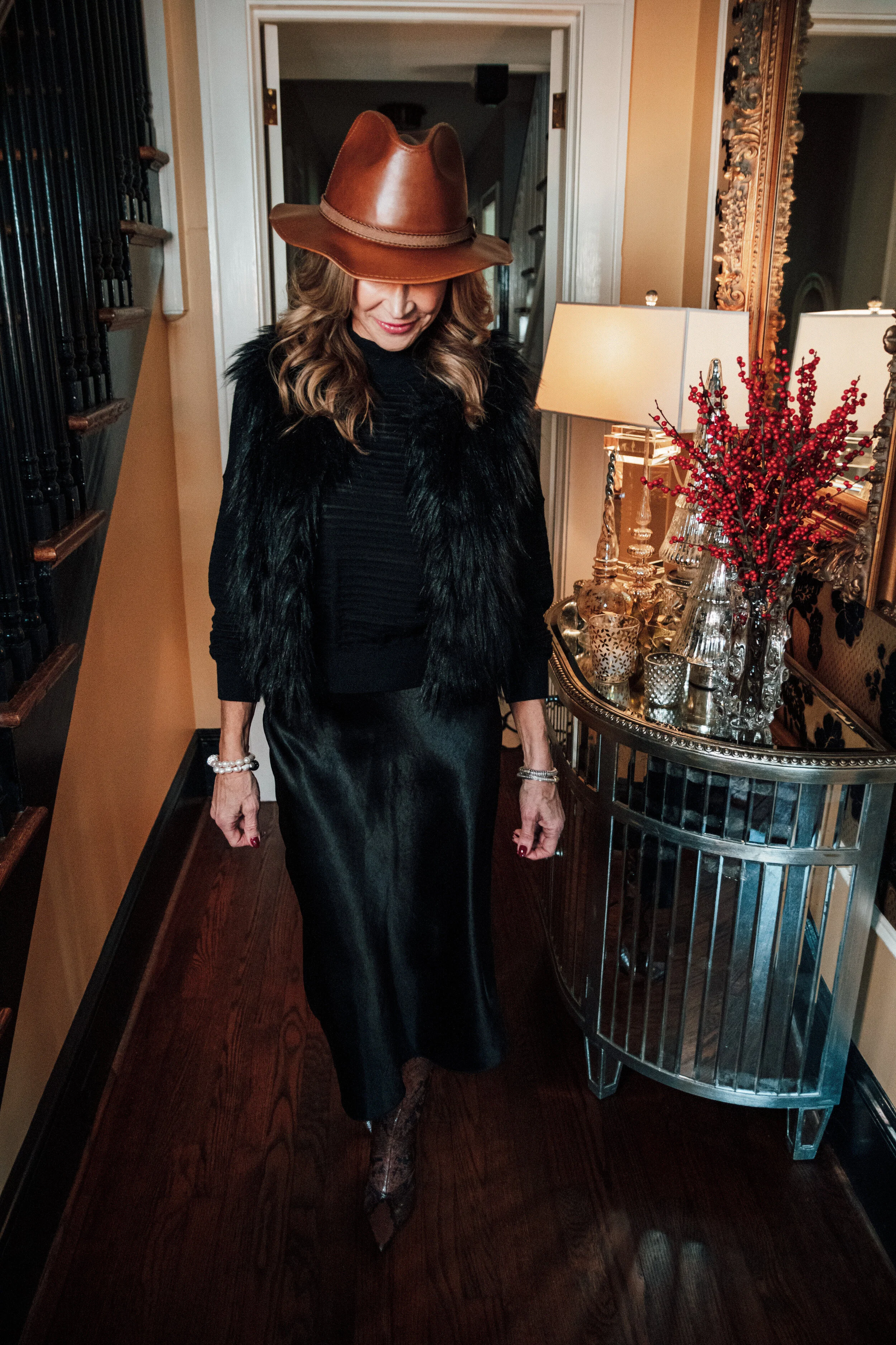 I decided to pair my hat with a maxi slip skirt from Vince, a cropped black mock neck from Autumn Cashmere (mine is from last season so Iβve linked a similar one) and some very fabulous snakeskin boots! (theyβre on sale now!) This outfit has been one of my favorites of the season. The skirt is so versatile because of its satiny look and feel and could be dressed up easily with a holiday top.